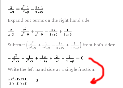 Hallo ist doch kein Problem. X²-9=(x+3)(x-3) Jetzt die Brüche einzeln erweitern damit der Nenner 3(X²-9) wird. Nach X², X und Xfrei sortieren. => Lösung