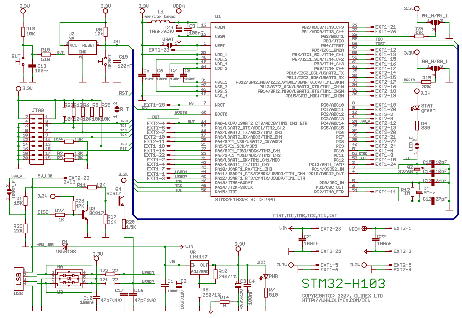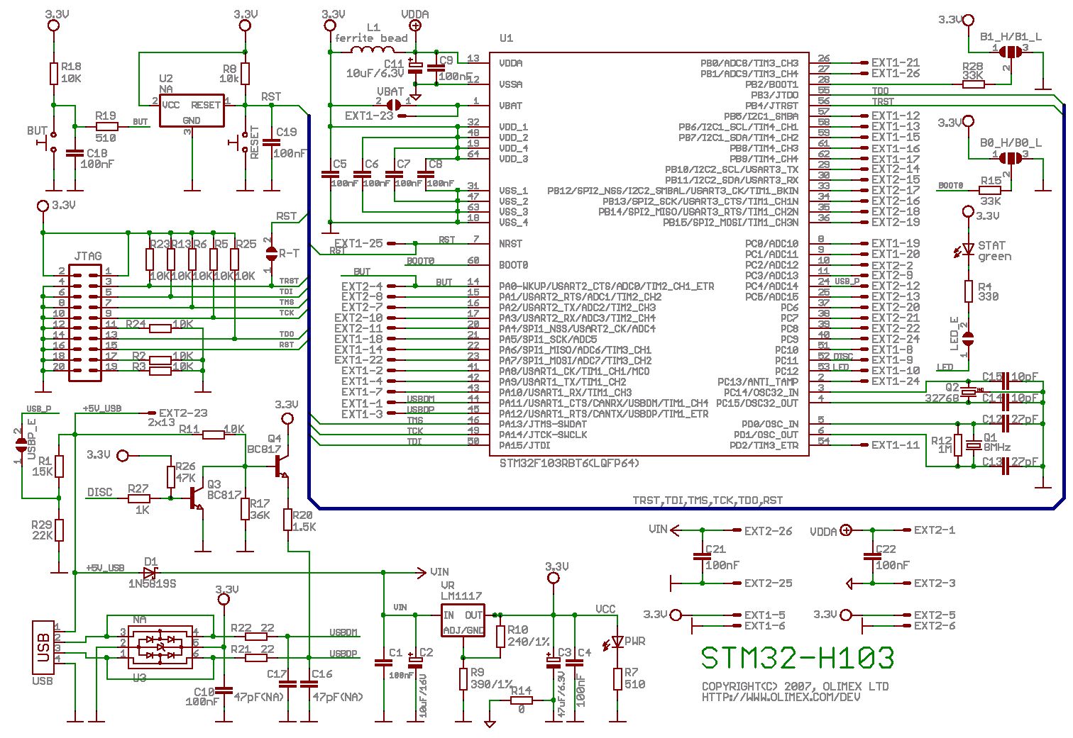 Guten Morgen, ich möchte das Virtual COM Port Projekt das man hier herunterladen kann http://www.mikrocontroller.net/articles/STM32_USB-FS-Device_Lib auf meinem STMH103 von Olimex zum laufen bringen. Nun ist die Frage was ich dafür alles am Projekt anpassen muss. Leider bin ich blutiger Anfänger. Bin schon von selbst drauf gekommen das in der hw_conf.h diese Zeilen angepasst werden müssen #define USB_CONNECT GPIOC #define USB_CONNECT_PIN GPIO_Pin_14 #define RCC_APB2Periph_GPIO_CONNECT RCC_APB2Periph_GPIOC ------------- #define USB_CONNECT GPIOA #define USB_CONNECT_PIN GPIO_Pin_14 // 11 oder 12? #define RCC_APB2Periph_GPIO_CONNECT RCC_APB2Periph_GPIOA Was muss denn noch angepasst werden damit es funktioniert? Habe mal den Schaltplan mit angefügt. MfG
