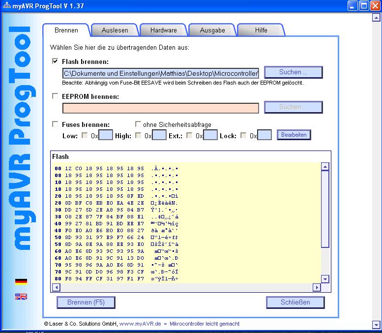 habe jetzt mal mit //siprog lancros si-prog// probiert aber auch nicht aber ich weiß auch nicht wo für sind diese FUSE BRENNEN da kann man hägchen setzen undwas eintipen .. Low: () 0x( ) High: () 0x ( ) Ext: () 0x ( ) Lock: () 0x ( ) und ist es richtig das ich in den Flasch schreiben will?