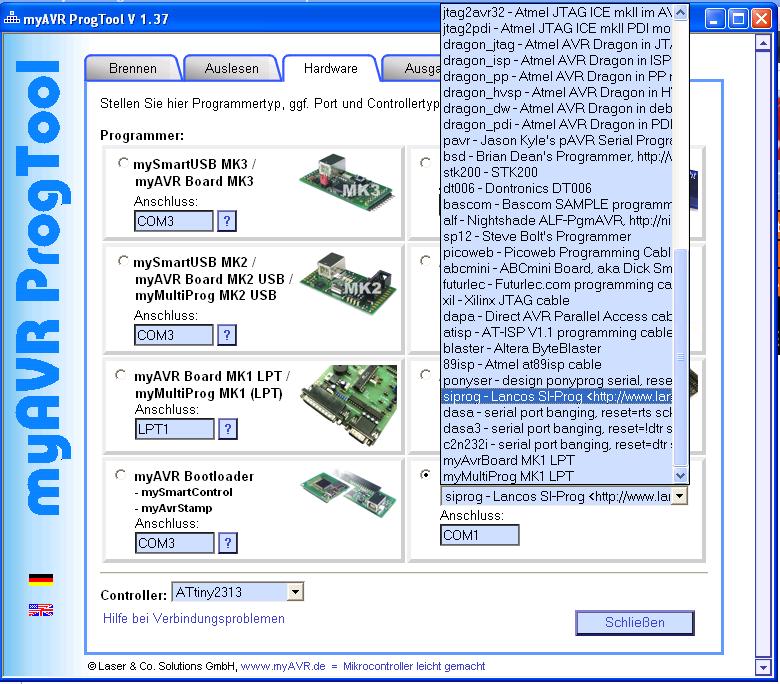 Guten Tag alle zusammen. Normalerweise bin ich nicht so oft in Foren unterwegs, deswegen hoffe ich das dieses Tehma nicht schon wo anderes aufgegriffenwurde. Ich habe vor kurzem angefangen mit Microcontrollern rumzuprobieren. Nun habe ich mir ein solches EvalutionsBoard gekauft von Pollin. http://www.pollin.de/shop/dt/NTI5OTgxOTk-/Bausaetze_Module/Bausaetze/ATMEL_Evaluations_Board_V2_0_1_Fertigmodul.html Ich habe einen Windows XP Rechner mit BASECOM-AVR benutzt um ein Programm zu erstellen. Nun muss die fertige .hex Datei nur noch auf den Controller (ATtiny 2313) Nun weiß ich bei dem Programm (myAVR ProgTool) nicht wie ich die Hardware auswählen soll. Ich gehe ja direkt via Serieller Schnittstelle auf den Controller. In dem Programm sind aber USB und Parallel Port Programmer zur auswahl. Nur das sogenante (STK 500) scheint ein Board zu sein das seriel beschrieben wird... Habt ihr ne Idee? Wenn ich was vergessen habe an Inforamtionen bitte fragen. Ich Danke im vorraus.