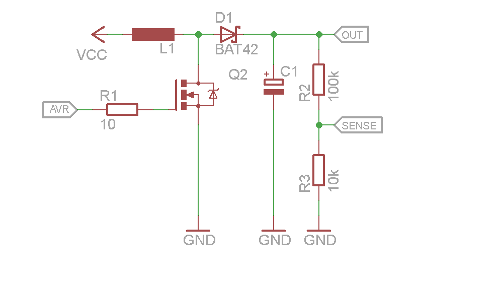 Hallo, ich benötige einen Aufwärtsregler mit folgenden Eckdaten: - Eingangsspannung ca. 3.7 V (LiIo Zelle) - Ausgangsspannung ca. 20 V (muß nicht sonderlich genau oder gesiebt sein) - Ausgangsstrom ca. 5 mA max. - Möglichst wenig Bauteile / platzsparend - Möglichst wenig Energieverbrauch wenn keine Strom entnommen wird Dazu habe ich mir die Schaltung im Anhang ausgedacht. Kann das so funktionieren, bzw. was könnte man verbessern? Als Takteingang wollte ich den ohnehin vorhandenen AVR nehmen. Geplante Bauteile: - MOSFET IRLML 2803 (30 V, 1.2 A, Rdson 0.25 Ohm) - Spule Würth TPC Speicherdrossel 1000 µH ( http://katalog.we-online.de/kataloge/eisos/media/pdf/744062102.pdf ) Gruß Werner