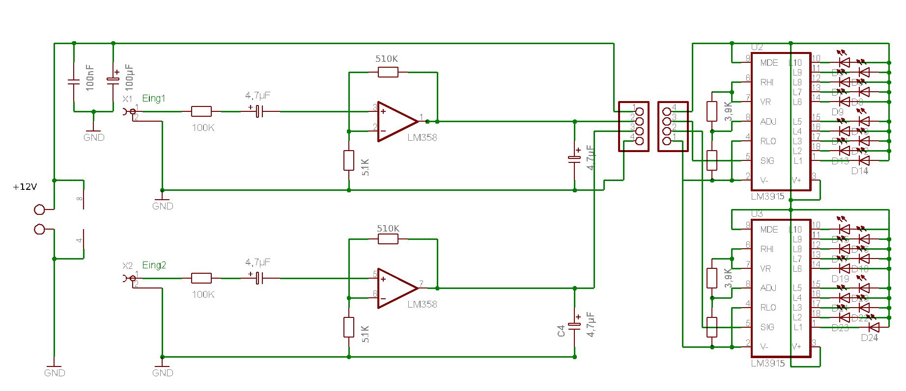 hallo, ich wollte mir in meine Aktiven Lautsprecher von ... (den namen weiß ich leider net aber auf der vorderseite steht surfsound) ein VU-meter einbauen in stereo mit 10 led´s pro kanal. habe mir dafür auch schnell einen schaltplan gemacht. ich wollte nun wissen ob ihr irgendwelche vorschläge oder ideen habt was man ändern oder verbessern könnte, oder kann man das so lassen wies ist?( Der OP solle einfach nur 100fach verstärken weil über den 100kohm Wiederstand ja 99% abfallen. [glaub ich zumindest]) Danke schon im vorraus