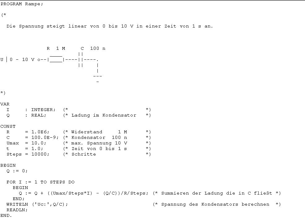 @Heinz, Nimm meine Formel. Die stimmt und ist überprüft mit LTspice. Hergeleitet habe ich sie mit Formeln aus der Laplace-Transformationstabelle. S = 10V/1s = 10V/s tau = R*C = 0,1s Uc(t) = S*tau*(exp(-t/tau)-1)+S*t Die Formel gilt solange die Eingangsspannung steigt. Falls die Rampe nach 1s endet, dann muss ab da mit einer anderen Formel gerechnet werden. "Warum in die Ferne schweifen, wenn das Gute liegt so nah."
