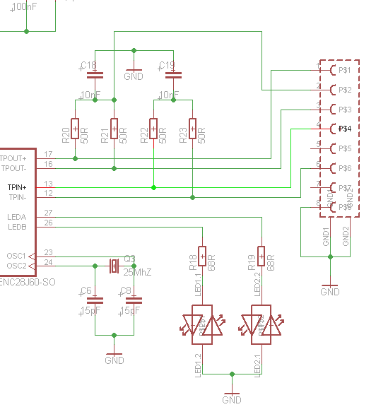 Die Mittelanzapfung der Tx-Wicklung muss über einen Ferrit mit VDD verbunden werde, da die Sendeendstufe des ENC nur gegen Masse Treiben kann, jedoch nicht gegen VDD. Aber kaputtmachen wirstr du nichts, wenn du das nicht tust. Der ENC kann halt nur nicht Senden. Oder meinst du noch etwas Anderes mit "völlig falsch"? Das Schatplansymbol sieht auch wie eine normale RJ45-Buchse. Du hast aber schon eine Buchse mit Übertrager benutzt, oder?