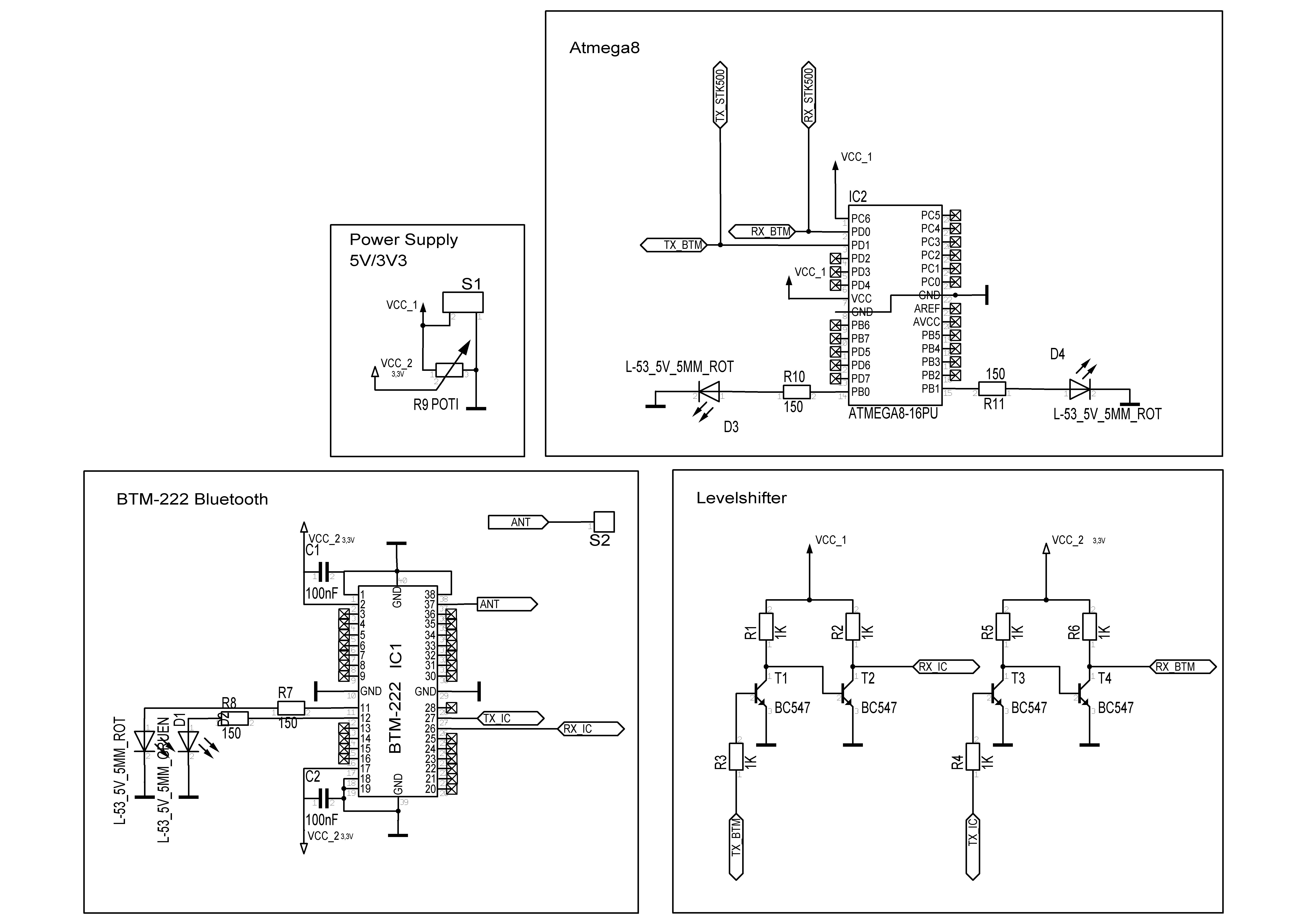 Hallo zusammen. Ich möchte einen AVR via Bluetooth mit meinem Smartphone steuern. Dazu habe ich ein Testprojekt erstellt, geätzt, gelötet, programmiert, angeschlossen und...Ergebnis: Atmega8 ( war gerade zur Hand ) läuft auf meiner Testplatine ( LED blinken ), spricht allerdings noch nicht mit BTM ( kommt später ). BTM-222 läuft auch ( LED blinken ) und ich kann auch Verbindung von Smartphone zum Modul herstellen. Problem: Nun muss ich den BTM-222 ja an nem PC erstmal einrichten ( Slavemode u.u .). Dazu habe ich mein STK500 ( ohne Kontroller ) mit RS232-Spare am COM1 und die TX/RX-Leitungen wie im Schaltplan verbunden. Supply des BTM-222 kommt vom STK und wird per Poti ( Spannungsteiler ) auf ca. 3,3V gepracht. Wie und mit welchem Programm kann ich nun auf den BTM-222 über das STK500 zugreifen? Mit AVRStudio ja nich - dafür ist RS232-CTRL vorgesehen.(?) Und das Hyperterminal sagt auch nichts:( Muss ich am STK500 noch weitere Einstellungen vor nehmen? Ich steh im Wald und langes, langes Lesen hat bisher nicht zum Erfolg geführt. Vielen, vielen Dank, wenn ihr da Lösungen habt!!! lG
