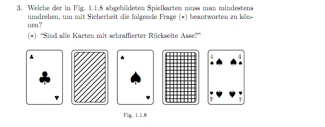 Zwischenfrage Mit "alle" in "Sind alle Karten mit schraffierter Rückseite Asse", sind da nur die hier liegenden Karten gemeint, oder alle Karten des kompletten Spiels? ICh würde mal meinen, dass man die 2.te die man nur von hinten sieht umdrehen (um festzustellen ob sie ein Ass ist) und die ganz rechte (wenn die ebenfalls schraffiert ist, dann stimmt die Aussage offenbar nicht).