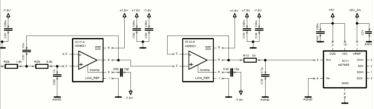 Salu zusammen Ich habe hier ein kleines Problem und bin mir nicht ganz sicher ob ich die Schaltung (Anhang) nicht vereinfachen kann. Umfang: Ich werde lediglich ein oder zwei Geräte bauen, von da her ist der Preis der Bauelemente nicht so entscheidend. Ich musste auch schauen was ich hier so bekomme, war daher auch ein wenig eingeschränkt. Genauigkeit ect: Ich möchte gerne den Drucksensor so genau wie möglich ausmessen. Schlussendlich soll der Drucksensor das begrenzende Glied in der Kette sein, nicht die Filter oder der ADC. Bauteilwahl: Hier einige, für mich bei der Suche ausschlaggebende Faktoren: Sensor: Klar, der Druckbereich. Temperatur kompensiert, linearisiert. 1ms um 10-90% Fullscale abzudecken (als genug schnell) OP: 2.5nV/Wurzel(Hz) Rauschen, Grosse Bandbreite…Ich weiss, dass ich diese Bandbreite hier nicht benötige. Da ich jedoch diesen OP auch in anderen Schaltungen, wo ich eben die Bandbreite benötige, einsetzen möchte findet er auch in der Schaltung seine Anwendung. Will nicht für alles wieder einen neuen Typ verbauen. Der OP wird von Analog Device auch als OP für ADC Vorstufen vorgeschlagen. Er ist für 16Bit tauglich. ADC: Auch hier musste ich ein wenig schauen was ich so bekam. Schlussendlich ist es ein AD7685 von Analog geworden. 16Bit, Approx. Speisung: Die Speisung des Analog Teils (+5V_AN und AGND)(Sensorspeisung Drucksensor, ADC Ref), werden direkt aus einer präzisen Bandgap Referenz mit 30mA Ausgangsstrom versorgt (Der Drucksensor benötigt max. 10mA und ist "leider" ratiometrisch). Da ich mit dem OP auch ganz auf 0 kommen möchte, muss ich ihn noch neg. speisen. Diese -7.5V werden aus einer positiven 7.5V Speisung mittels ICL7660 gewonnen. Die positive Speisung besteht aus einem LM2594. Diese Speisung ist sehr gut gefiltert. Der restliche Teil der Schaltung wird mittels 5V Linearregler (MCP1702) aus der +7.5V Speisung versorgt. Nun zur Filterkette: Da es sich um einen Sensor, handelt welcher lediglich einen Ausgangsstrom liefert, ist ein Widerstand zwingend notwendig (51k). Dies habe ich aus dem Datenblatt so übernommen. Als nächstes kommt ein Impedanzwandler, da ich den Sensor ja nicht mit der darauf folgenden Filterschaltung belasten möchte. Das Filter ist ein Butterworth Filter 4. Ordnung mit einer Grenzfrequenz von ca. 15kHz. Dies garantiert (habe ich simuliert), dass ich bis ca. 3kHz keine Dämpfung habe. Danach nimmt es, wenn auch nur marginal, ab. So, und nun die Frage: Im Datenblatt des ADC steht, dass, wenn man eine Quellenimpedanz grösser 30Ohm hat, man einen Impedanzwandler vorschalten sollte. Benötige ich nun den 4. OP in der Kette noch? Dieser stellt ja einen erneuten Impedanzwandler dar. Das anschliessend folgende Filter ist ein Antialiasing Filter welches von Analog Device so für den ADC vorgeschlagen wird. Bitte entschuldigt das es ein bisschen mehr geworden ist. Wäre toll wenn ich die ein oder andere Meinung zu der Schaltung bekommen würde. Und eben, es ist ein „Einzelstück“, ob nun ein Bauteil mehr oder weniger verbaut wird ist eigentlich egal. Will halt gerne mal was Genaues machen. Einfach an den ADC Eingang klemmen macht ja keinen Spass ;o) Das Layout sollte kein Problem darstellen, da ich 10 Jahre mal als Layouter gearbeitet habe. Denke dass sollte ich hinbekommen :o) Grüessli Layouter