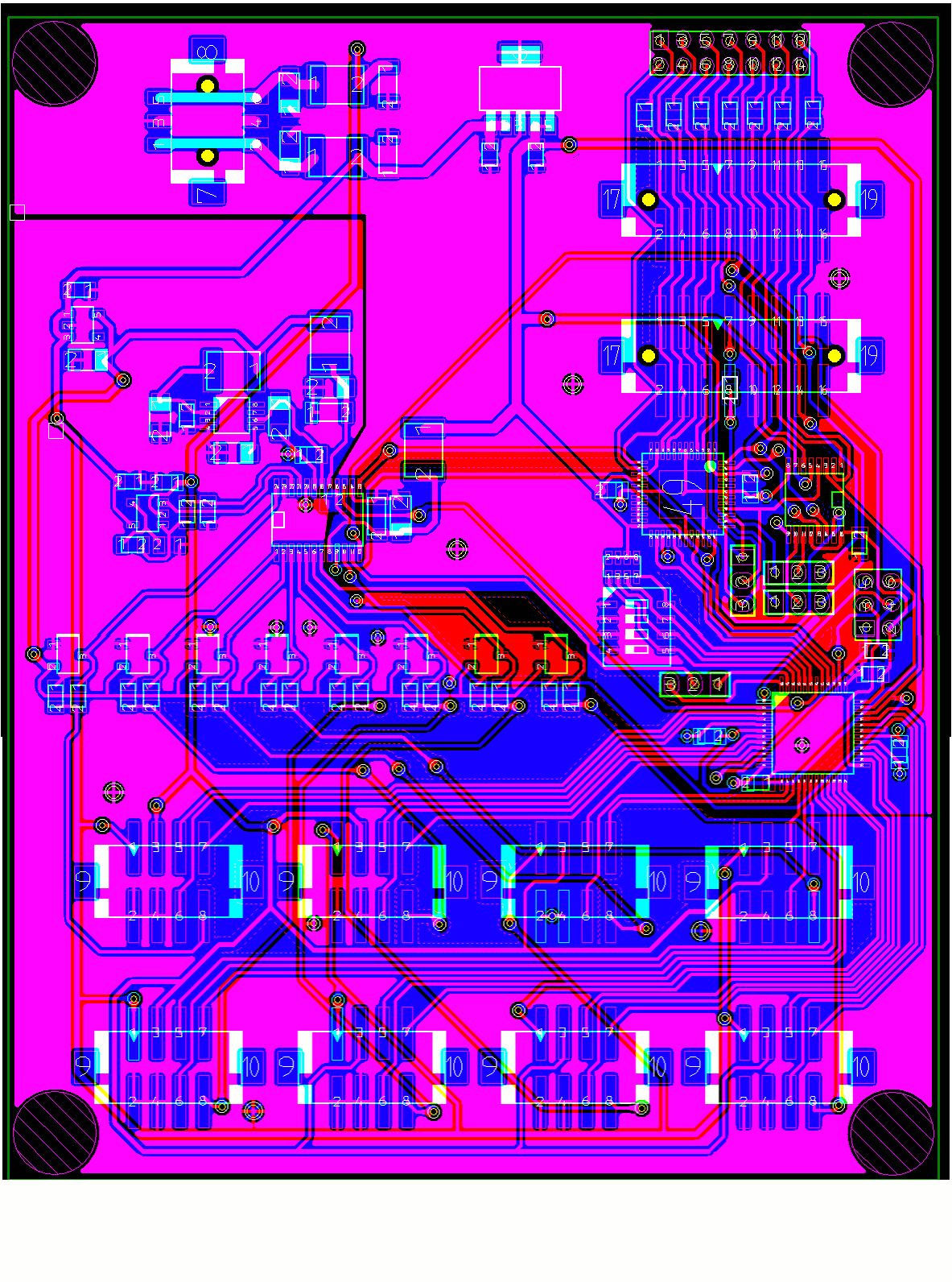 Hallo zusammen, habe nur wenig Erfahrung im Layout-Erstellen und wollte euch mal um Beurteilung/Kritik zu diesem Layout bitten. Die Platine ist 2-lagig und ist als 1. Prototyp zum Testen gedacht. Die 8 Stecker unten sind zum Anschliessen von 8 Sensoren, die jeweils ein analoges Spannungssignal liefern und eine Umschaltung der Verstärkung haben. Diese wird mit einem 3-bit-breiten "Signal" umgeschaltet, welches auch über diese Stecker den Sensoren zugeführt wird. Dieses Signal kommt vom CPLD (der TQFP-Baustein über einem von diesen 8 Steckern rechts). Die analogen Signale werden mit einem ADC gewandelt und per SPI (differentiell LVDS) an die Steuerung weitergegeben. Die LVDS-Treiber/Receiver sind rechts, darüber sind die SPI-Stecker (davon 2, weil über den anderen ein weiteres (oder mehrere) gleiches Board im Chain-Mode angeschlossen wirden kann. Soweit grobe Beschreibung der Funktion. Wäre dankbar für Hinweise, was nicht in Ordnung ist, welche groben Fehler es gibt. Wieviel Zeit braucht ein erfahrener Layouter für eine Platine mit dieser Komplexität? Habe Tage damit verbracht.