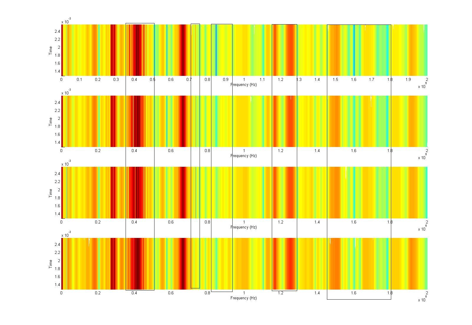 Hallo Freunde, bräuchte eure Hilfe bei der Programmierung eines Bandpass Filters. Ich habe ein Signal, das ihr im Bild1 sieht. Dies wurde mittels eines Ultraschalls mit einer Fs = 400 kHz aufgenommen. Rausgegeben wird es als ein 2000x1 Double Vektor. Dieses Signal habe ich in ein Spektogramm (Bild2) umgewandelt, mit dem folgenden Code: spectrogram(Messung, 1024,512,1024,Fs,'yaxis'); Nun würde ich gerne ein Bandpass Filter auf die im Bild2 gekennzeichneten Markierungen setzen. Dazu fehlen mir leider die nötigen Kenntnisse. Ich bin wirklich für jede Hilfe und jeden Vorschlag dankbar. Verfüge über die Signal Prozessing Toolbox, aber bräuchte Hilfe mit den Einstellungen: Design Method: IIR oder FIR, und Unterpunkte Match exactly: Passband oder Stopband Welche Filter order? Frequency Specs: Fs (400000?), Fstop Magnitude Specs: Squared oder dB Gruß Zu Bild1: Es ist im Zeitbereich von 0 bis 5 ms Zu Bild2: In diesem Bild sind 4 verschiedene Signale