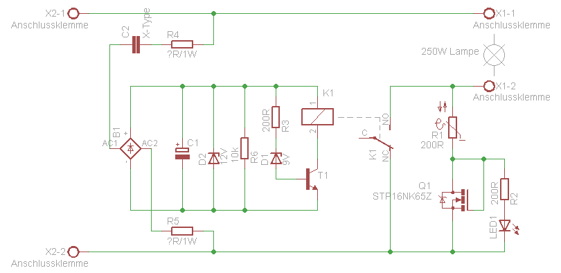 Das Haus hängt an dem gleichen Stromnetz wie alle anderen im Umfeld. Und die Hauselektrik ist auch nicht anders. Ich wage zu bezweifeln, dass sie öfter durchbrennen als alle Anderen. Einzig eine Herstellerabhängigkeit mag vielleicht erkennbar sein, aber das billigste vom billigen ist halt mal nicht perfekt. Ein Sanftanlauf für Glühbirnen ist aber auch nichts verwerfliches und schadet sicher nicht. Darum soll es aber nicht gehen. Für das LED-Problem habe ich denke ich heute eine recht einfache Lösung gefunden (siehe Anhang). Noch habe ich zwar nicht alle Widerstands- und Kondensatorwerte bestimmt und ich vermute auch, die Relaisverzögerung wird sich so nicht sinnvoll auf 1-2s ausdehnen lassen, aber der Teil, der diesen Thread betrifft sollte so funktionieren denke ich. Die Idee war über eine Z-Diode eine Konstante Spannung abfallen zu lassen und so einen Stromfluss durch den NTC zu detektieren. Da ich allerdings keine geeignete Z-Diode finden konnte hab ich mir einen FET rausgesucht, dessen Threshold-Spannung und Body-Diode einen ähnlichen Effekt erzielen dürften. Trotzdem aber vielen Dank. Und wenn ich arge Fehler mache, dürft ihr mir bitte gerne bescheid geben.
