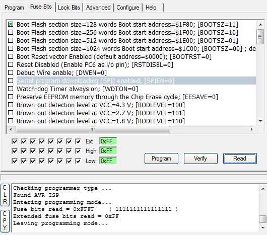 Hallo, ich habe eben das bit "Reset Disabled" der Fusses fälschlicherweise entfernt und nu hat mein Atmega168 die Fuses verstellt;-( Siehe Anhang Der Controller läuft aber noch mit seinem vorher übertragenden Programm. Doch da sich jetz ganz andere Fuses eingestellt haben, komm ich per ISP auch nicht mehr auf den yC, da das bit "Serial program downloading" auch deaktiviert ist. Was habe ich denn jetzt noch für eine Möglichkeit? yC --> Tonne?