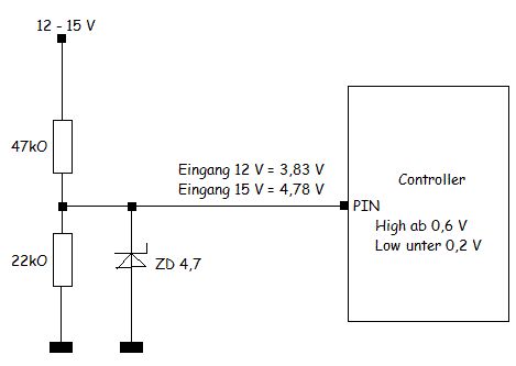 Hallo Andy, ein Widerstandsteiler ist dafür schon genau das richtige. Du kannst den Teiler ja so einstellen, dass bei 15V nicht mehr wie 5V am Controller ankommen. Zusätzlich sollte man den Eingang noch mit einer 5.6V Zenerdiode schützen, denn im KFZ hast Du schnell mal ein paar Spannungspitzen auf dem Netz. Als Eingang am Mikrocontroller kannst Du z.B. einen AD (Analog Digital Wandler) Eingang benutzen, dann kannst Du den Wert für Tür auf/zu selber festlegen. Oder Du benutzt den Analogkomparator Eingang. Genaueres findest Du im Datenblatt Deines Controllers, auch zu den Pegeln, wann ein H oder L erkannt wird. Gruß, avrGerd