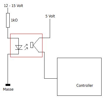 Hey das geht ja schnell hier. Also gut, da hab ich dann doch schon mal meine erste Lektion gelernt mit den Mikrocontrollern. Also 12 V Eingang immer mit Optokoppler, richtig? Hab wieder auf die Schnelle was gezeichnet. Geht das, fehlt noch was, explodiert das? ;) ;) ;) Andy