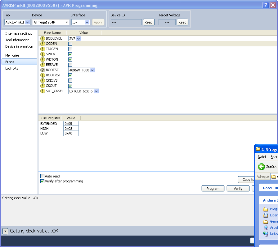 Also die Versorgungsspannung des Atmega 1284p liegt bei 4,8V Der Oszillator wird mit 3V betrieben, ich hab den AVR jetzt so programmiert, wies oben ist, mit dem Ergebnis, dass ich nicht mehr auf diesen zugreifen kann. Was habe ich falsch gemacht? Der Oszillator schwingt auf jeden Fall mit 20 Mhz