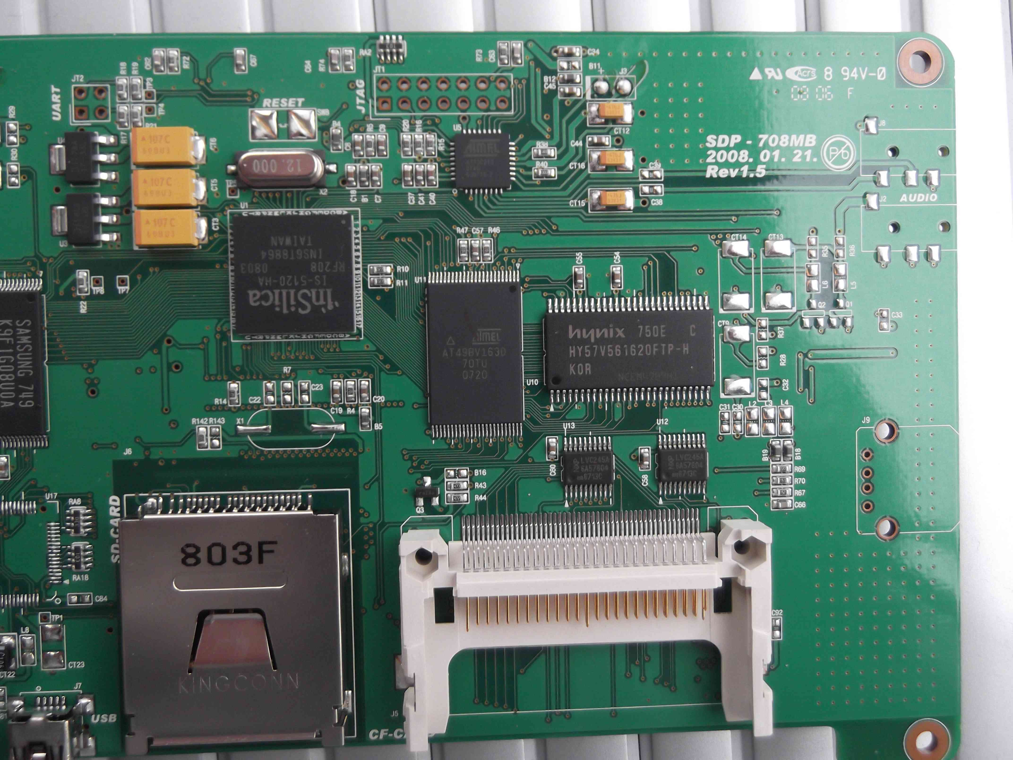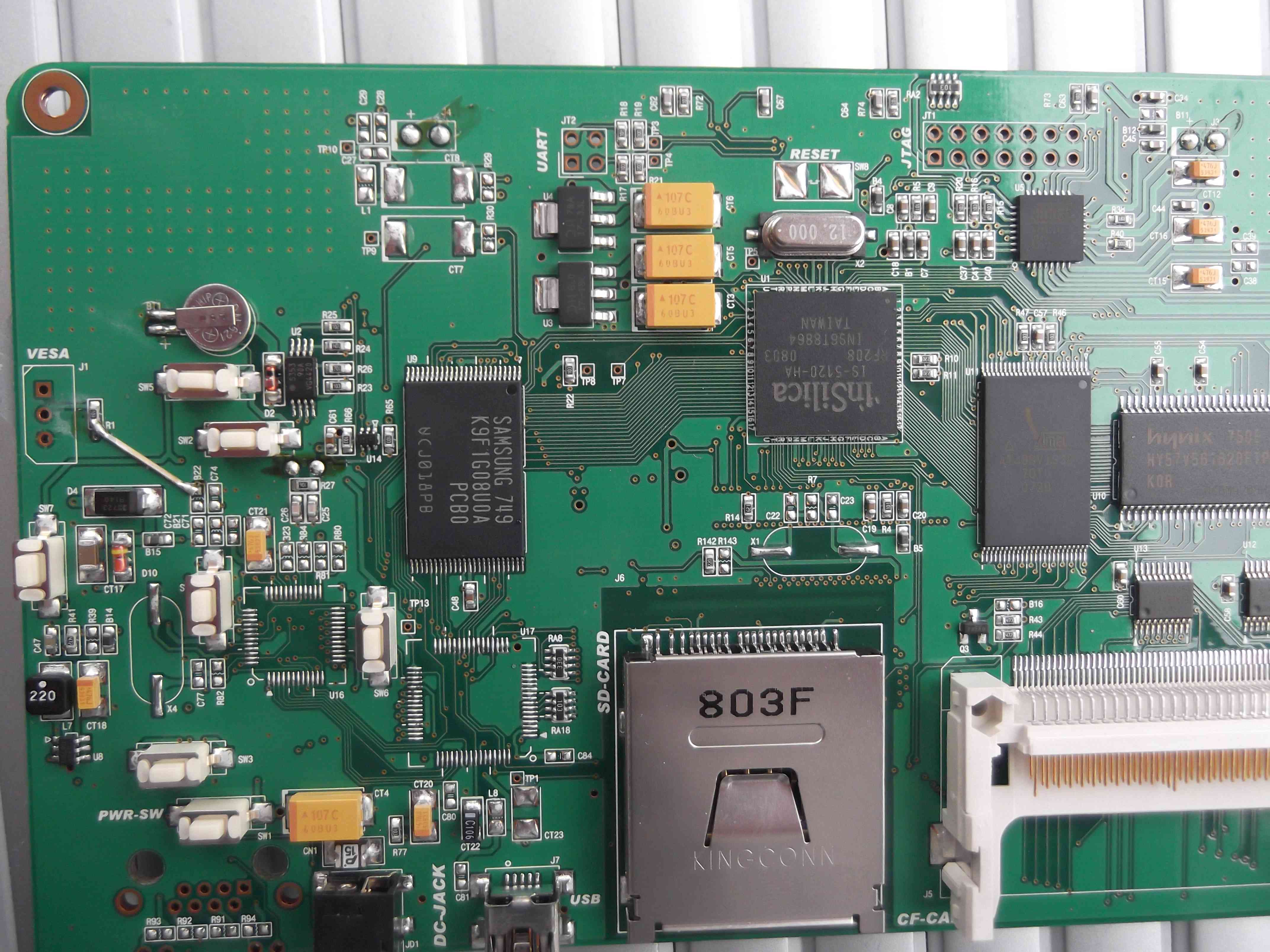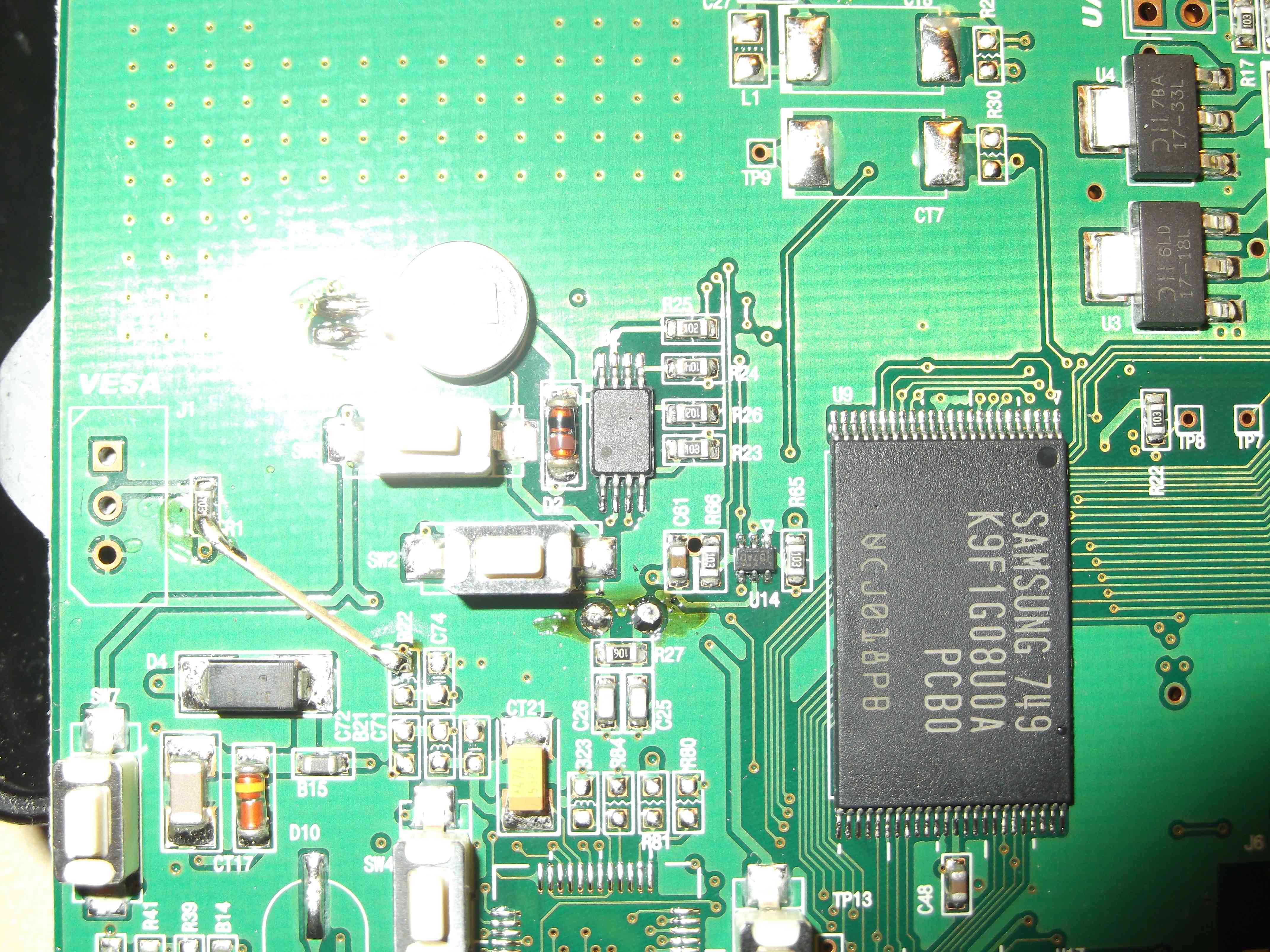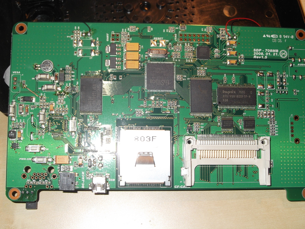 Folgende Chips sind drauf: SAMSUNG 749 K9F1G08U0A -> Richtung Vesa Insilica IS-5120-HA -> neben dem Flash hynix Atmel(gross) AT49BV163D Atmel(klein) A173C219 -> neben JTAG Interface Da ist noch ei Plätzchen für´n USB Print Device (J9) -> neben dem weissen CF Slot. -> könnte es wirklich eine sein und wenn ja, Buchse Print? Zumindest sieht das so aus... Am Vesa Port weiss ich nicht wie ich das anschliessen/löten sollm ..