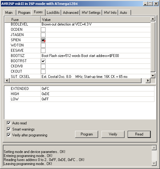 Thomas schrieb: > Hier ein Screenshot der Fuses. CKOPT sehe ich nicht. Bei den neueren Controllern kannst du das unter "SUT CKSEL" auswählen. "Full Swing ... Crystal.." mfg.