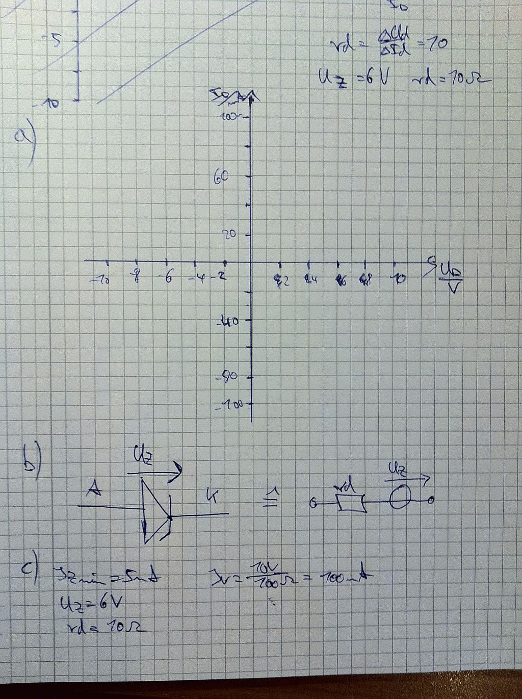 Hi, ich hänge bei folgender Aufgabe. http://www.imagebanana.com/view/zceak4cw/IMG_0602.JPG Mein Ansatz: http://www.imagebanana.com/view/7xm628b6/IMG_0603.JPG a) ich würde es ungefähr so zeichen http://www.elektronik-kompendium.de/sites/bau/diagramm/02012111.gif Nur wie berechne ihc die einzelnen werte? Mit dieser Formel? rd =dU/dI ? b) sollte so stimmen denke ich. c) fallen an der z-Diode nicht ständig die 6V ab unabhängig vom RL? Klar ist da eine kleine schwankung welche jedoch nur im mV bereich ist. gruß