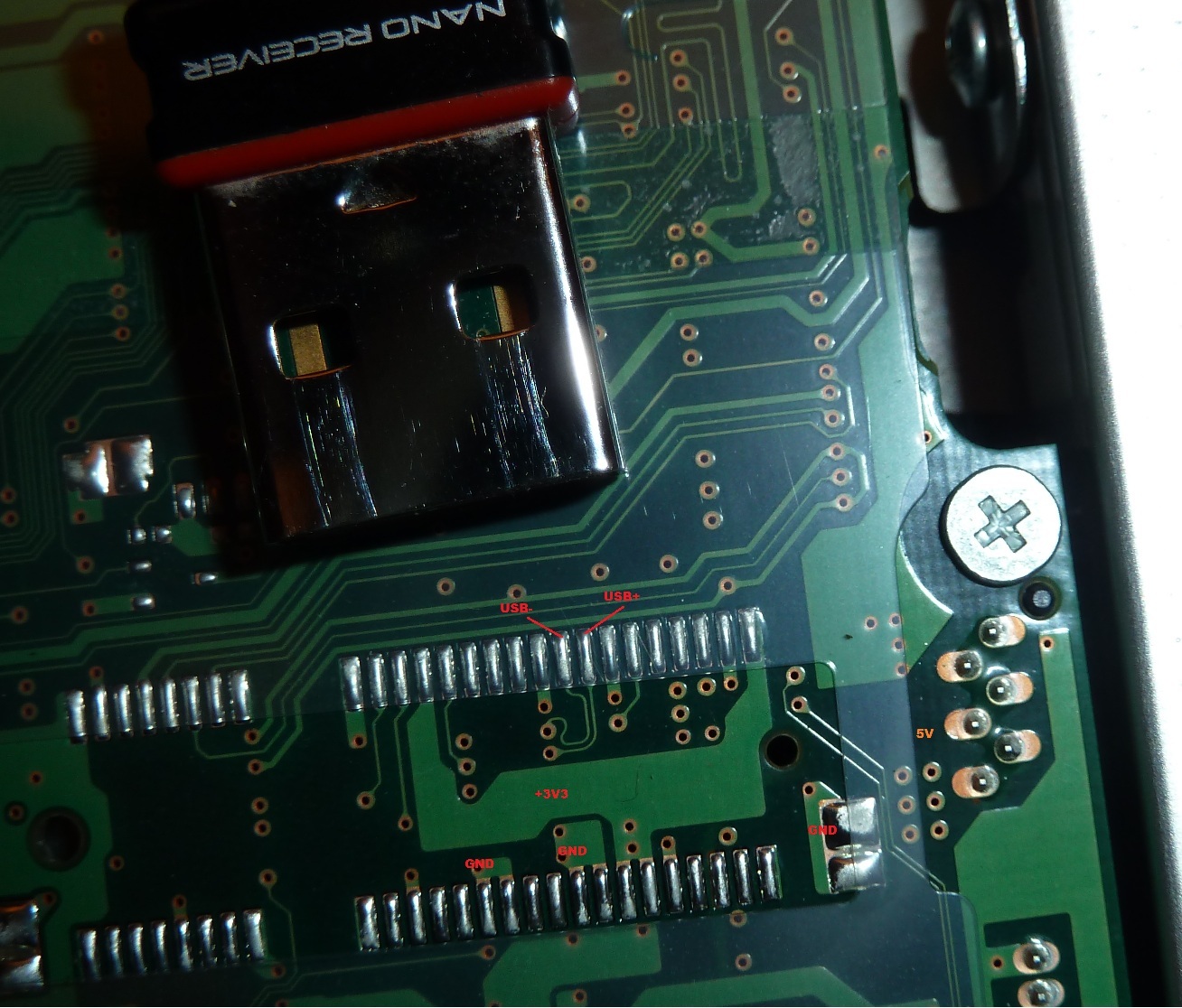 Hier mal ein Bild, dessen was ich vor habe. Der Nano Receiver soll an den USB Port des PCIe Slots angelötet werden. Die Besonderheit: Die pcie Lanes sind gar nicht verdrahtet, sondern nur USB und Spannung + Simkarten Signale. Der Port war für ein internes UMTS Modem vorgesehen. Ich will da jetzt den Empfänger der Maus anschließen. Habe beim benachbrten CD Rom Laufwerk aber nch 5V gefunden. mfg