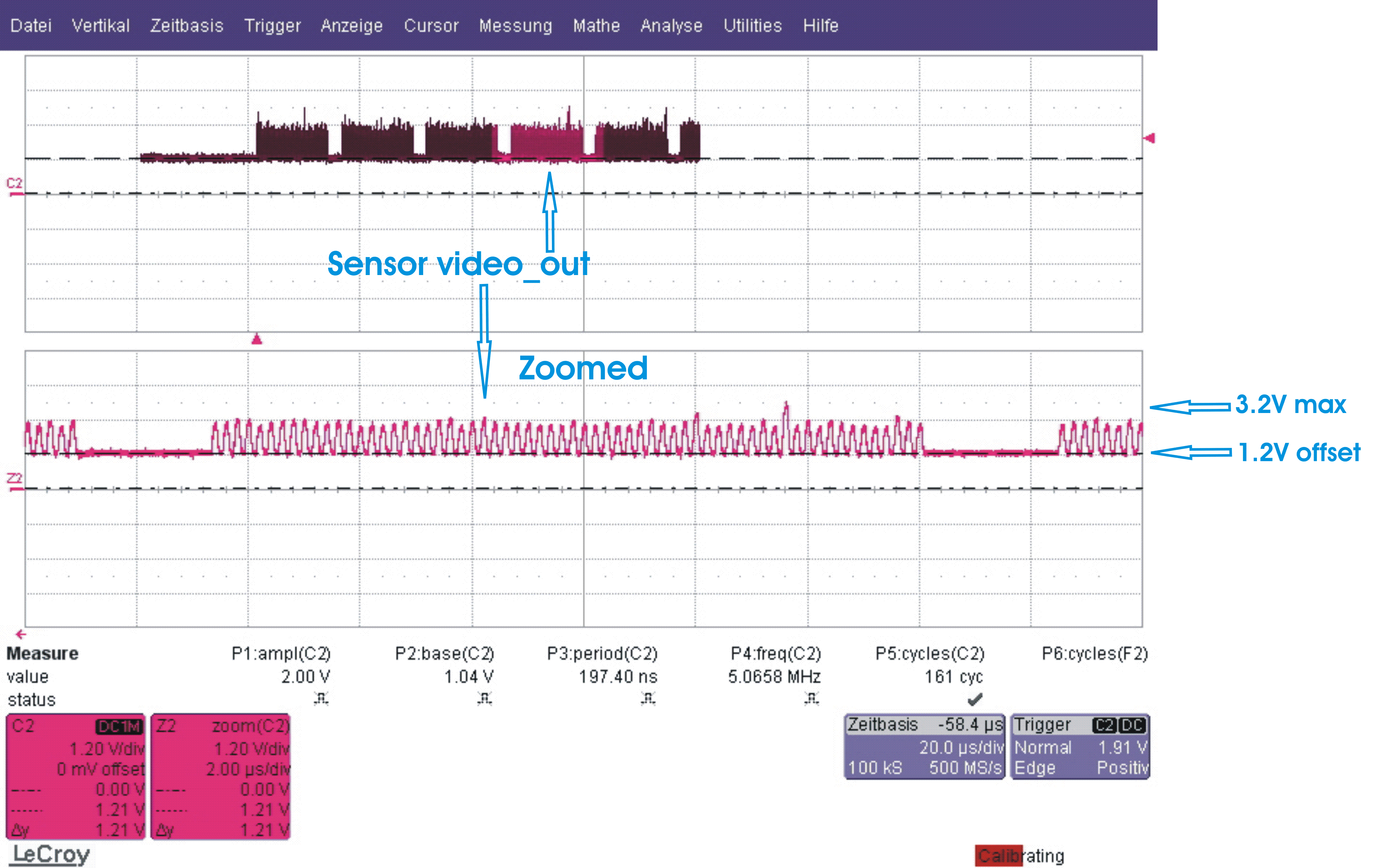 @Gerd E. ich möchte nicht doppelt abtasten, es würden also auf 5MSPS reichen, da hast du recht. Es handelt sich um einen InGAas-Sensor mit einer Empfindlichkeit von bis zu 1.9µ welchen ich für NIR-Erkennungen nutzen möchte. Ich kann leider keine genauen Daten rausgeben, da es sich bei dem Sensor um einen Prototypen handelt. Ich mache auch nur die Elektronik dazu, die Optik ist nicht mein Part. @Pico: Ich habe aber nur ein Signal welches aus dem Sensor kommt und zwar die Pixel (video_out). Benötige ich für eine differentielle Messung nicht auch noch ein Referenzsignal? Kann ich mir dieses selbst erzeugen? Ich habe die Ansteuerung des Sensors soweit abgeschlossen und benötige Hilfe bei der Wandlung der Pixeldaten in 16bit. Die "Pixelspannungen" liegen zwischen 1.2V und 3.2V (video_out), also offset=1.2V. Ich dachte ich könnte dieses Signal nun "einfach" auf einen 16bit ADC geben, welcher als Bottom Reference=1.2V und als Top Reference=3.2V geliefert bekommt, oder ist das nicht günstig? Wie bereite ich solche Daten korrekt für die Wandlung auf? Habe mal eine Osziaufnahme mit angehängt welche das video_out-Signal darstellt. Dieses möchte ich jetzt so perfekt wie möglich wandeln und benötige dafür einen 16bit-ADC. THX for RE!