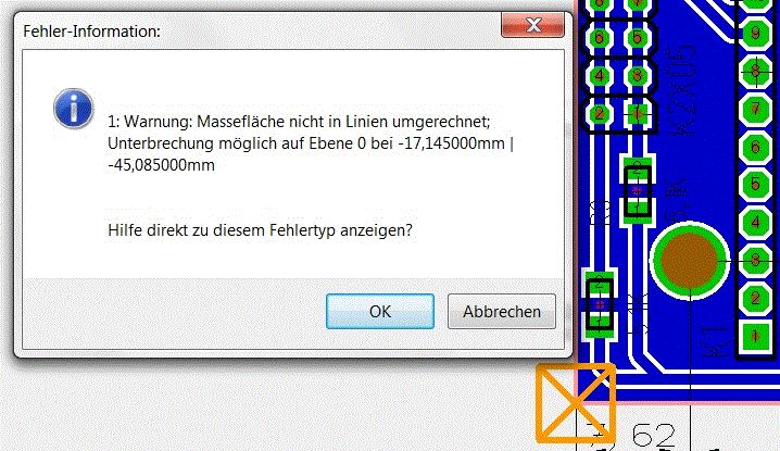 PS: die letzte Meldung kannst du getrost ignorieren ... das Umrechnen der Masseflächen in Linien hat den gewaltigen Nachteil, dass das mächtig auf die Rechenpower geht beim Bearbeiten des Layouts. Kann man zum Schluss machen wenn das Layout fertig ist, hab aber bislang auch ohne das alle PCBs gefertigt bekommen. Ist aber mitunter sinnvoll, da man sich dabei Inseln entfernen lassen kann, dann sieht man ob irgendwo Teile der Massefläche nicht mit verbunden sind. Aktionen -> Massefächen -> Masseflächen generieren -> Reiter: Massefläche in Linien umrechnen