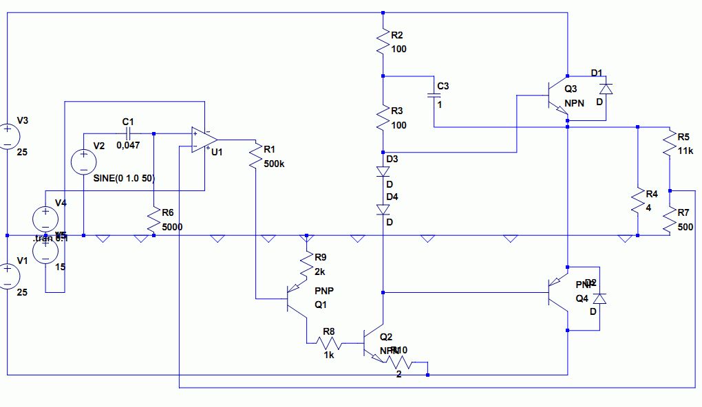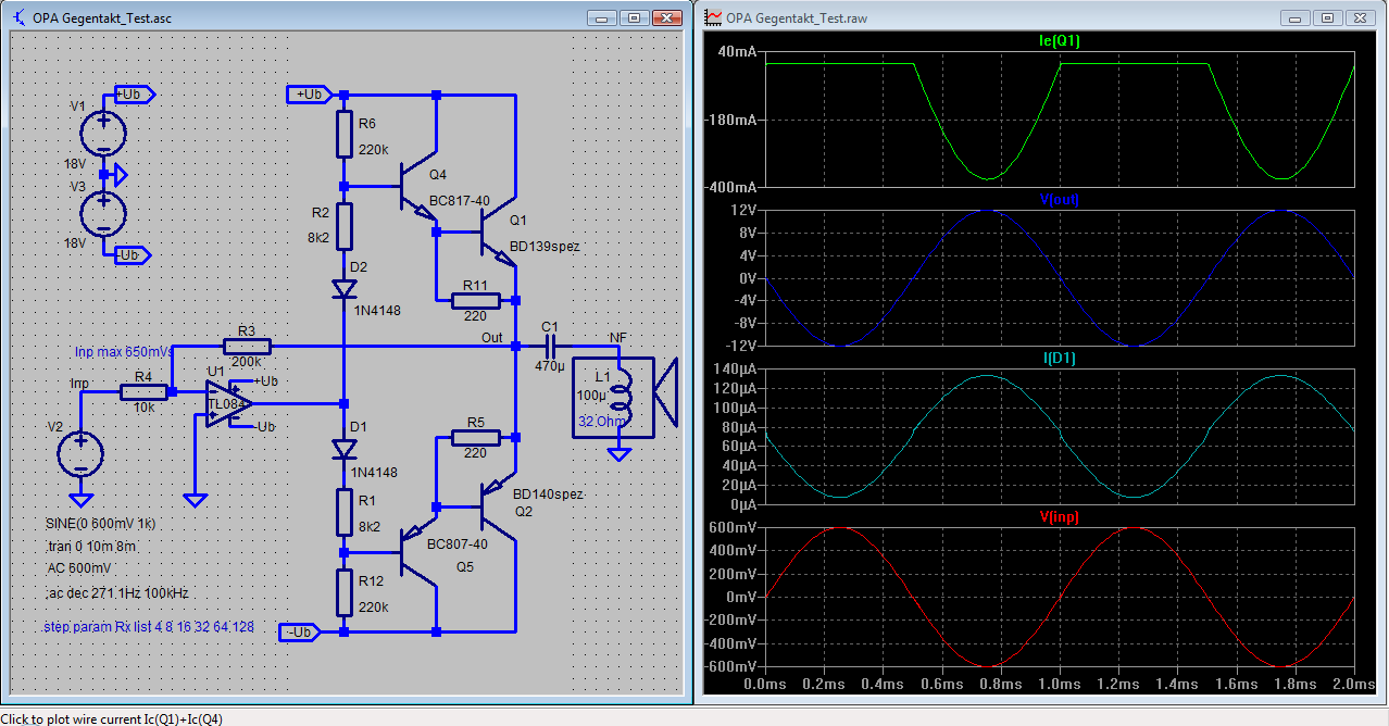 Hallo Alfons, falls Du ernsthaft am "Durchstieg" bei Verstärkern, aber auch anderen Schaltungen interessiert bist, möchte ich Dir das kostenlose Simulationsprogramm "LTspiceIV" empfehlen, welches kostenlos von der Seite [http://www.linear.com/designtools/software/#Spice] herunterladen kannst. Weitere Links finden sich auf [http://www.elektronikbasteln.pl7.de/linkliste-zu-ltspice.html]. Vieles ist in englischer Sprache, aber ein umfangreiches DEUTSCHES TUTORIAL gibt es auf der Seite von Gunthard Kraus [http://www.elektronikschule.de/~krausg/] zum runterladen. Dazu gibt es auch noch die Yahoo-LTspice-Gruppe [http://tech.groups.yahoo.com/group/LTspice/] in welcher man sich weitere Anregungen Tips, Bauteilmodelle usw abholen kann. Zum "Appetit holen" habe ich Dir mal die Abbildung einer Schaltung als Anhang beigefügt. Die Schaltung habe ich hinsichtlich der Endstufe von der Seite [http://www.elektronik-kompendium.de/public/schaerer/endstu_t.htm] "abgekupfert" und hinsichtlich der Bauteilwerte mit Hilfe von LTspice optimiert. Wie Du siehst lassen sich Spannung, Strom, Leistung und mehr grafisch darstellen. Eine Beschreibung aller Möglichkeiten wäre wirklich sehr umfangreich. Das Schöne ist, man macht nichts kaputt und wenn eine Schaltung in der Simulation arbeitet, kann man diese auch nachbauen um zu sehen wie eine Schaltung in der "realen Welt" funktioniert. Gruss Ottmar P.S, ... dann lassen sich auch die vorgenannten Schaltungserweiterungen rasch auf grundsätzliche Eignung prüfen...
