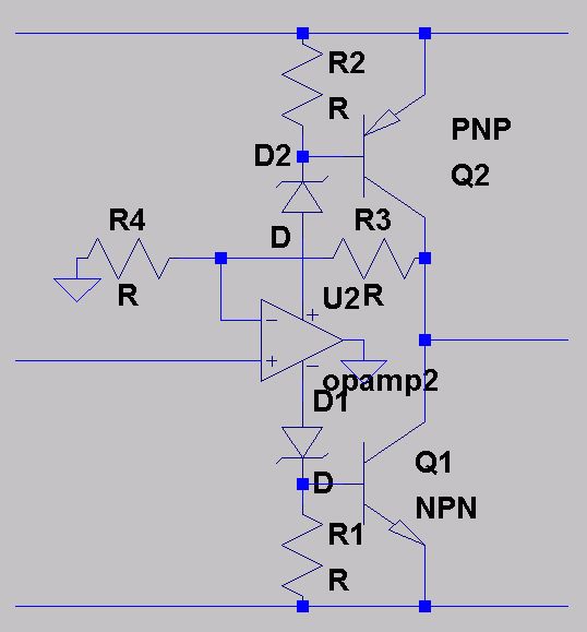 @ einer (Gast): ???? Ich möchte ja nicht den Op-Amp "nur" von der (zu) hohen Versorgungsspannung schützen; ich möchte die gesamte Spannungsamplitude, die von der Versorgungsspannung zur Verfügung gestellt wird, mit den Endtransistoren "nutzen". Und das gelingt doch mit den Zenerdioden nicht, da die Emitterspannung von Q1 und Q2 nicht über die Zenerdiodenspannung "hinauskommet" (Emitterfolger).
