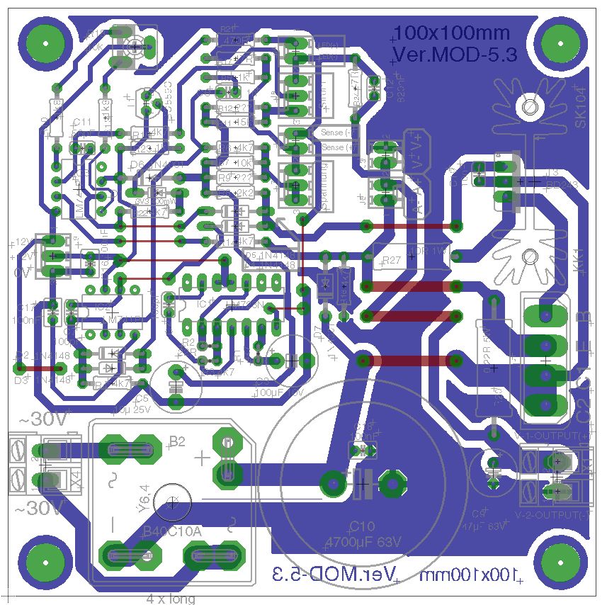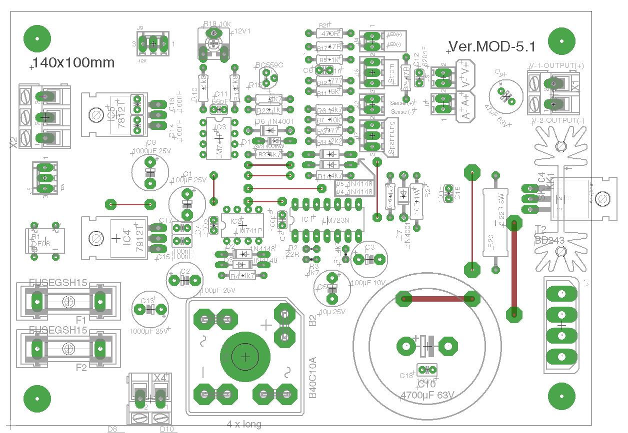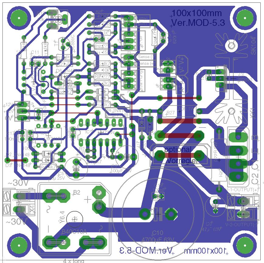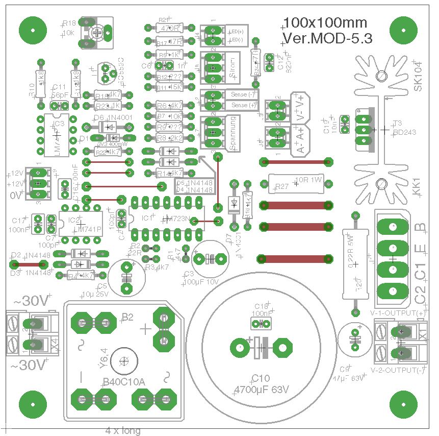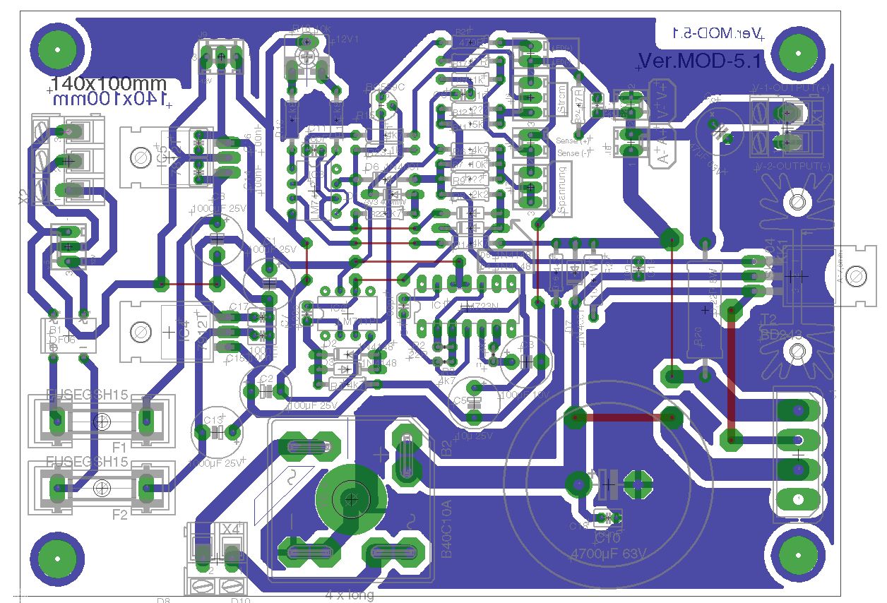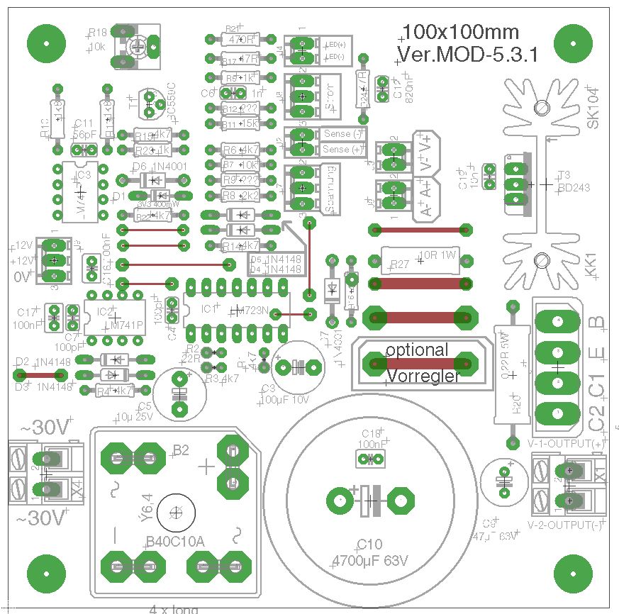 Ok, es ist soweit! Habe noch mal ERC durchlaufen lassen! Ich stelle jetzt das Finale Layout zur Verfügung. Labornetzteil-Mod-4 ist die Version mit Hilfsspannungstrafo 2x12V auf der Platine. Labornetzteil-Mod-5 ist eine Version ohne Trafo. Dafür gab es mehr Platz für den Treibertransistor mit Kühlkörper. Verschiedene Bauformen sind beigefügt, sowie optional Molex Pinheader 2 Pol, 3 Pol, 2,54mm Raster mit Verpolungsschutz für die Potis, Sense u.s.w... 2x12V stabilisiert nach aussen geführt für die Versorgung von evtl. Anzeigeinstrumente, Kontroll-Led's u.s.w. Ich wünsche viel Spass damit und wünsche frohes Basteln. :-) Gruß Michael