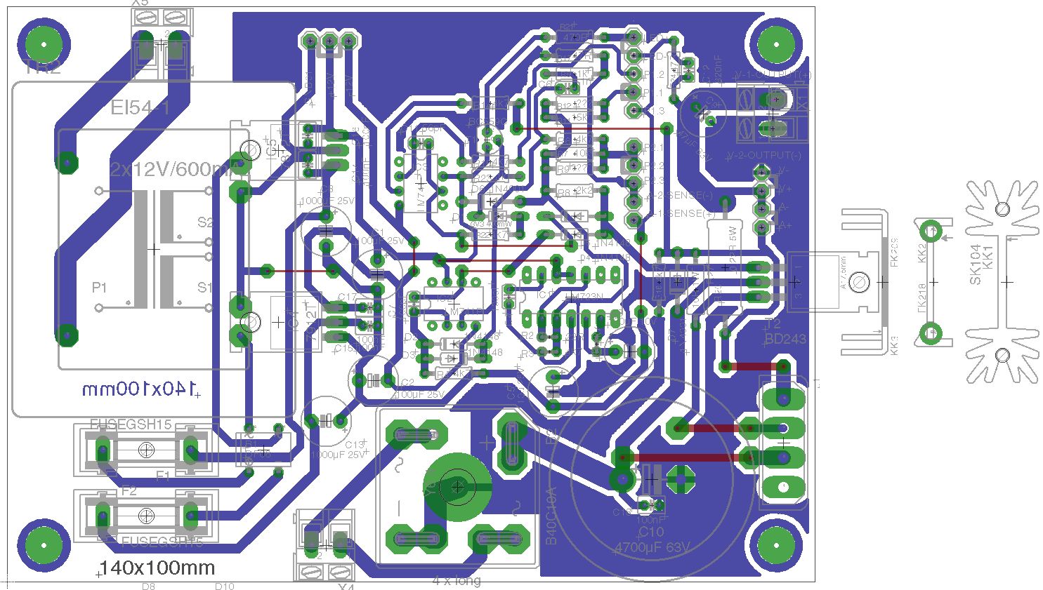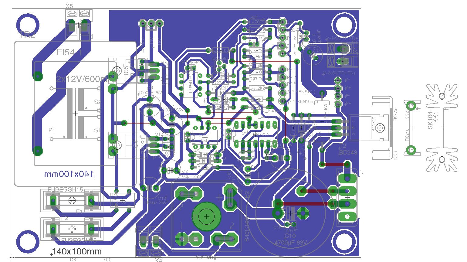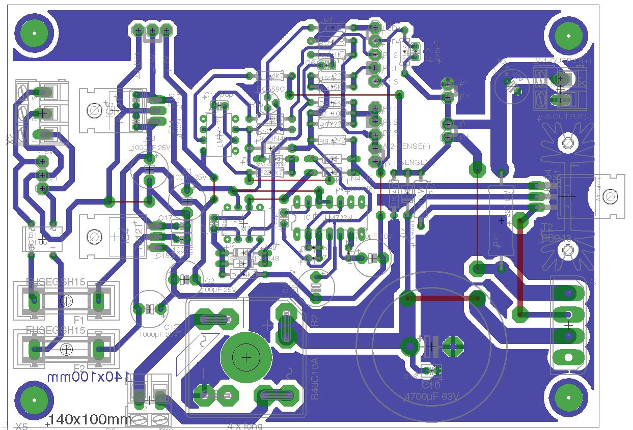 So, im Anhang befindet sich die Hilfsspannungsplatine. ...ist nur ein kleiner Beitrag, aber damit der arme Michael nicht noch mehr planen muss... Es gibt drei Ausgangspinheader: Einen für die Hilfsspannung des Netzteiles, einen für meinen Frequenzgenerator und einen für eine Festspannung von +12V; 0V; -12V bis 1A, welche das Netzteil optional noch ausgeben kann (lohnt sich natürlich nur bei entsprechend groß dimensioniertem Trafo). Die Platine ist schön klein geworden (45mmx75mm). Und ja, ich bin ein Freund der fetten Leiterbahnen ;-)