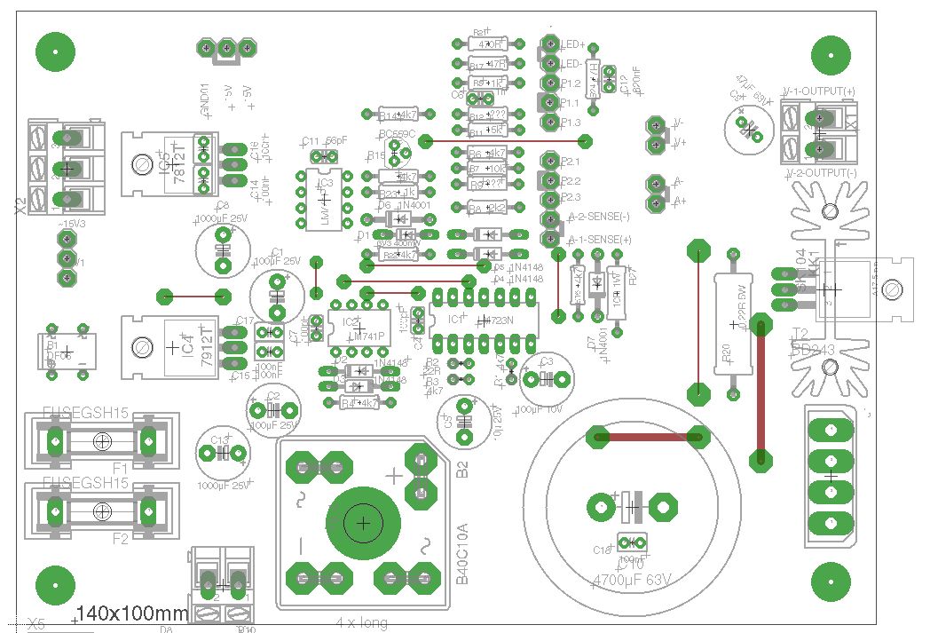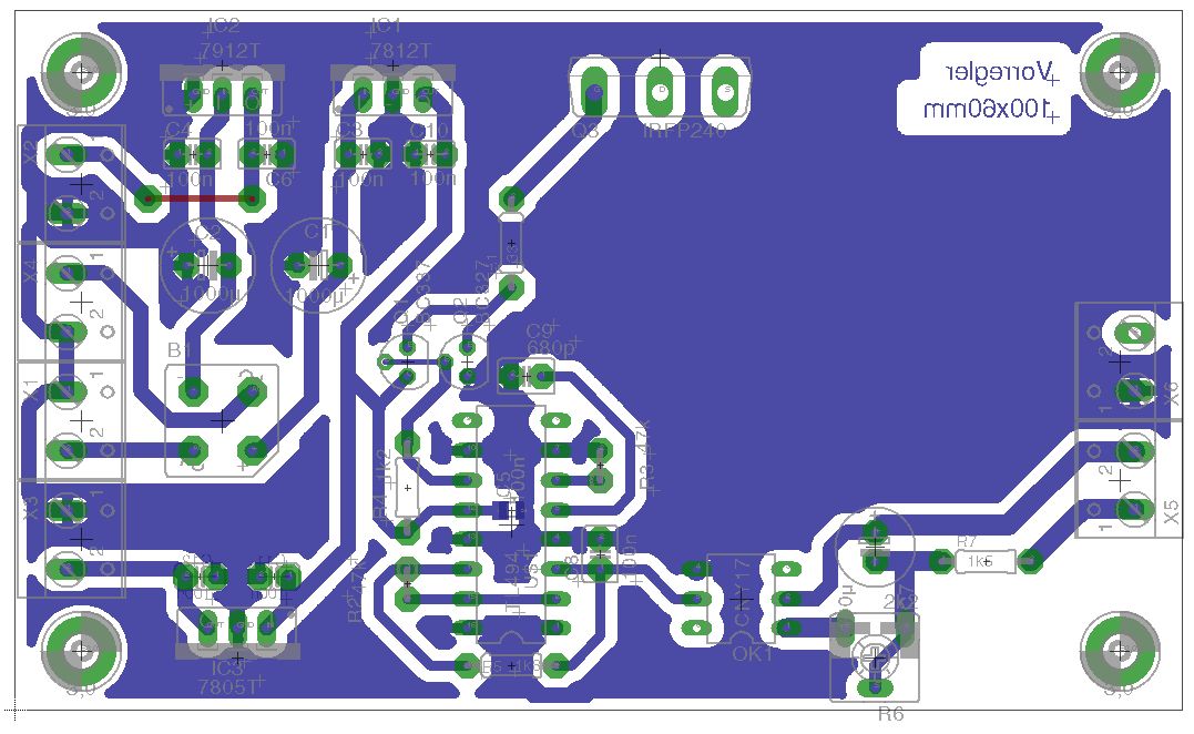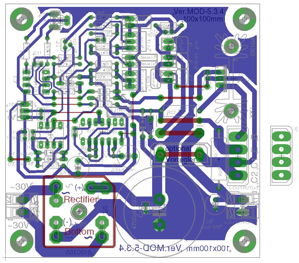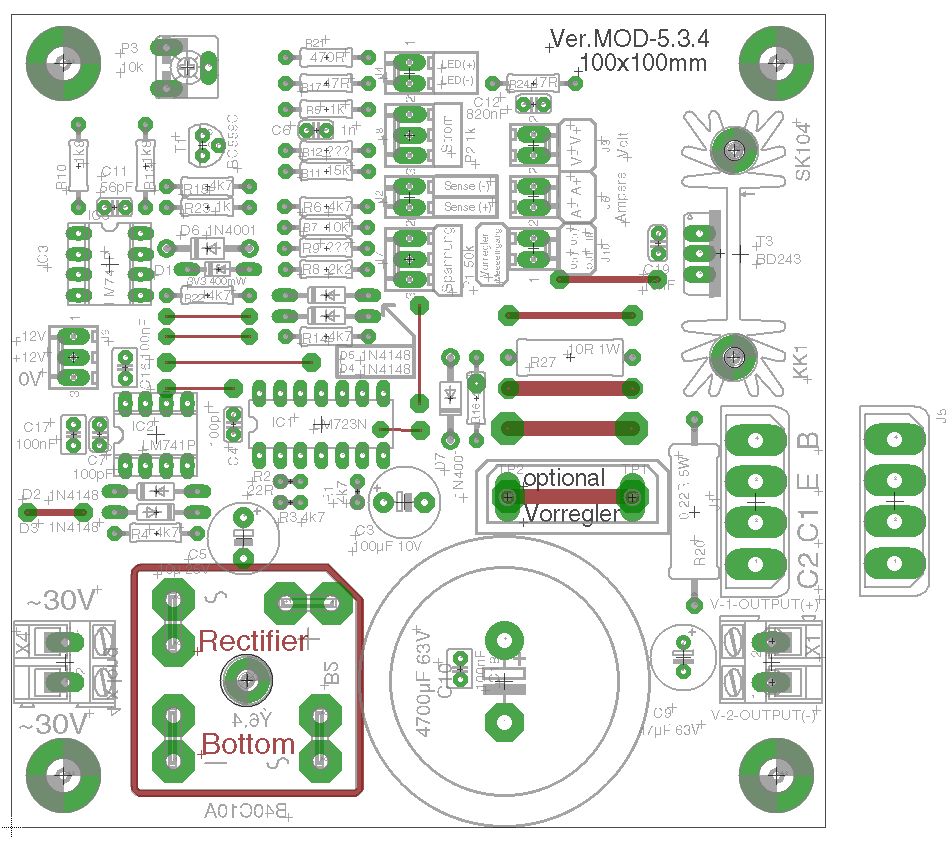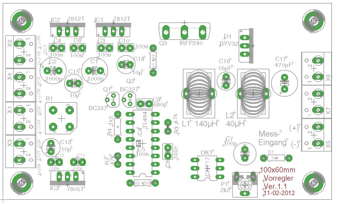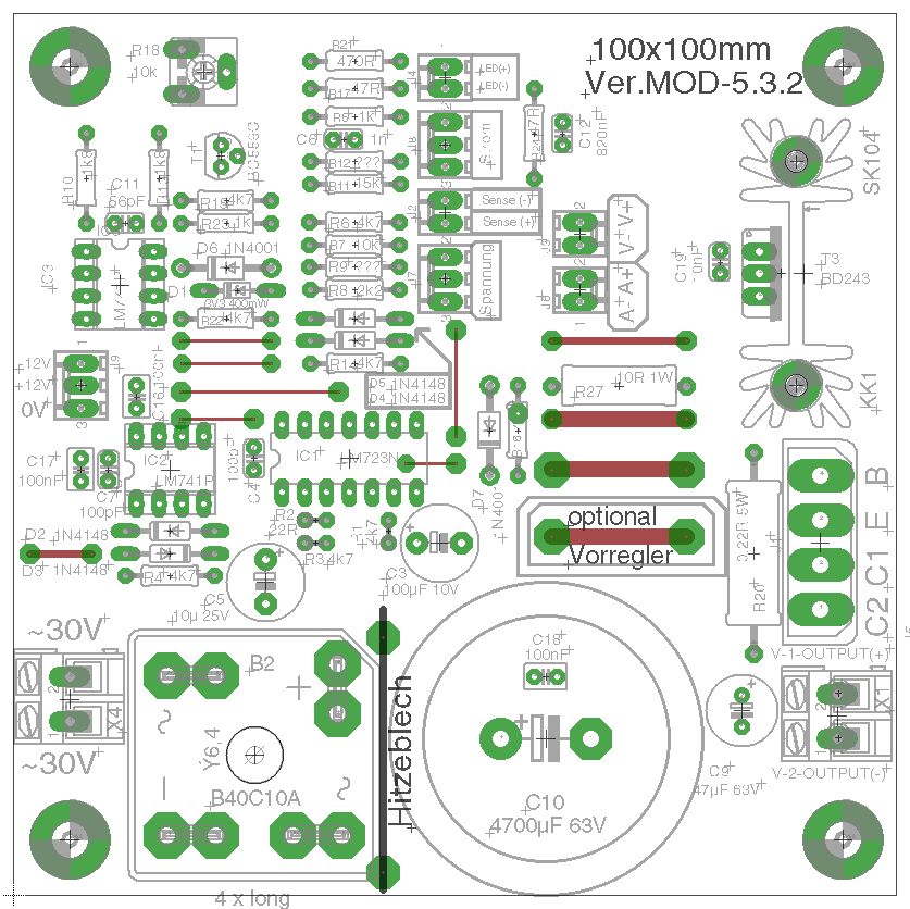 Hallo Fritz, vielleicht klatscht du noch einen 7805 "nach" dem 7812? Du ärgerst dich später, wenn dir die Spannung für das DVM fehlt! Nach den 100nF Kerkos fehlen noch 10-22µF Elkos zum Ausgang hin. Man könnte noch für jede Ausgangsspannung eine Kontroll-LED andenken, ich mache das immer so, da weiß man gleich, das alles stromt. Da fällt mir gerade ein, das ich das in meiner Version auch noch nachrüsten müsste. Update: Der große Gleichrichter ist blöderweise auf der "Topside" zu montieren obwohl ich das Teil gespiegelt hatte, kann ich mir jetzt nicht erklären :-( Habe fast alle Löcher vom Mainboard gebohrt. Danach kommt der Bestückungsaufdruck drauf und die Kupferseite bekommt ihren Schutzlack. Heute Abend gibt's noch Fotos vom Prototyp! ;-) Ist der Johann hier irgendwo? Es fehlt noch etwas Input vom Vorregler... Gruß Michael