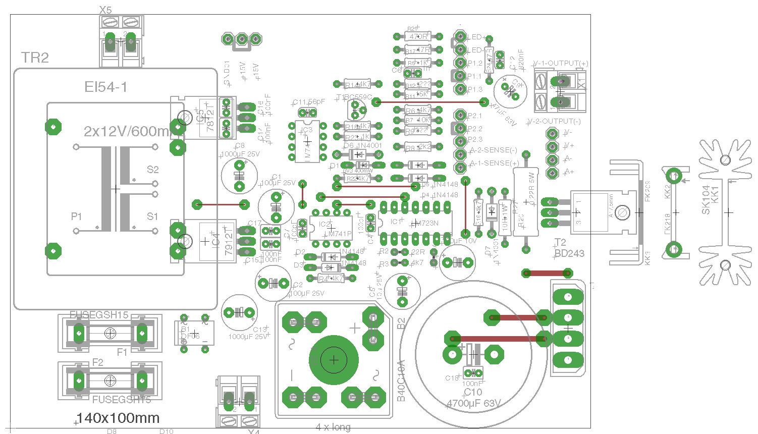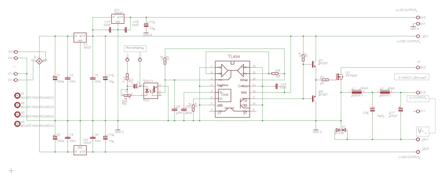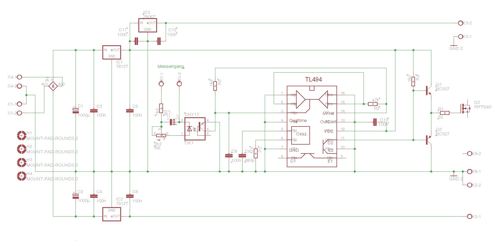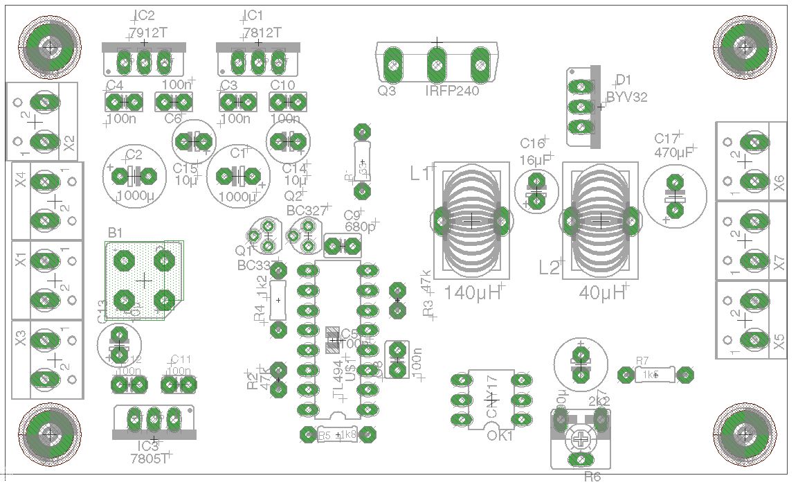 Hallo Fritz, vielleicht klatscht du noch einen 7805 "nach" dem 7812? Du ärgerst dich später, wenn dir die Spannung für das DVM fehlt! Nach den 100nF Kerkos fehlen noch 10-22µF Elkos zum Ausgang hin. Man könnte noch für jede Ausgangsspannung eine Kontroll-LED andenken, ich mache das immer so, da weiß man gleich, das alles stromt. Da fällt mir gerade ein, das ich das in meiner Version auch noch nachrüsten müsste. Update: Der große Gleichrichter ist blöderweise auf der "Topside" zu montieren obwohl ich das Teil gespiegelt hatte, kann ich mir jetzt nicht erklären :-( Habe fast alle Löcher vom Mainboard gebohrt. Danach kommt der Bestückungsaufdruck drauf und die Kupferseite bekommt ihren Schutzlack. Heute Abend gibt's noch Fotos vom Prototyp! ;-) Ist der Johann hier irgendwo? Es fehlt noch etwas Input vom Vorregler... Gruß Michael