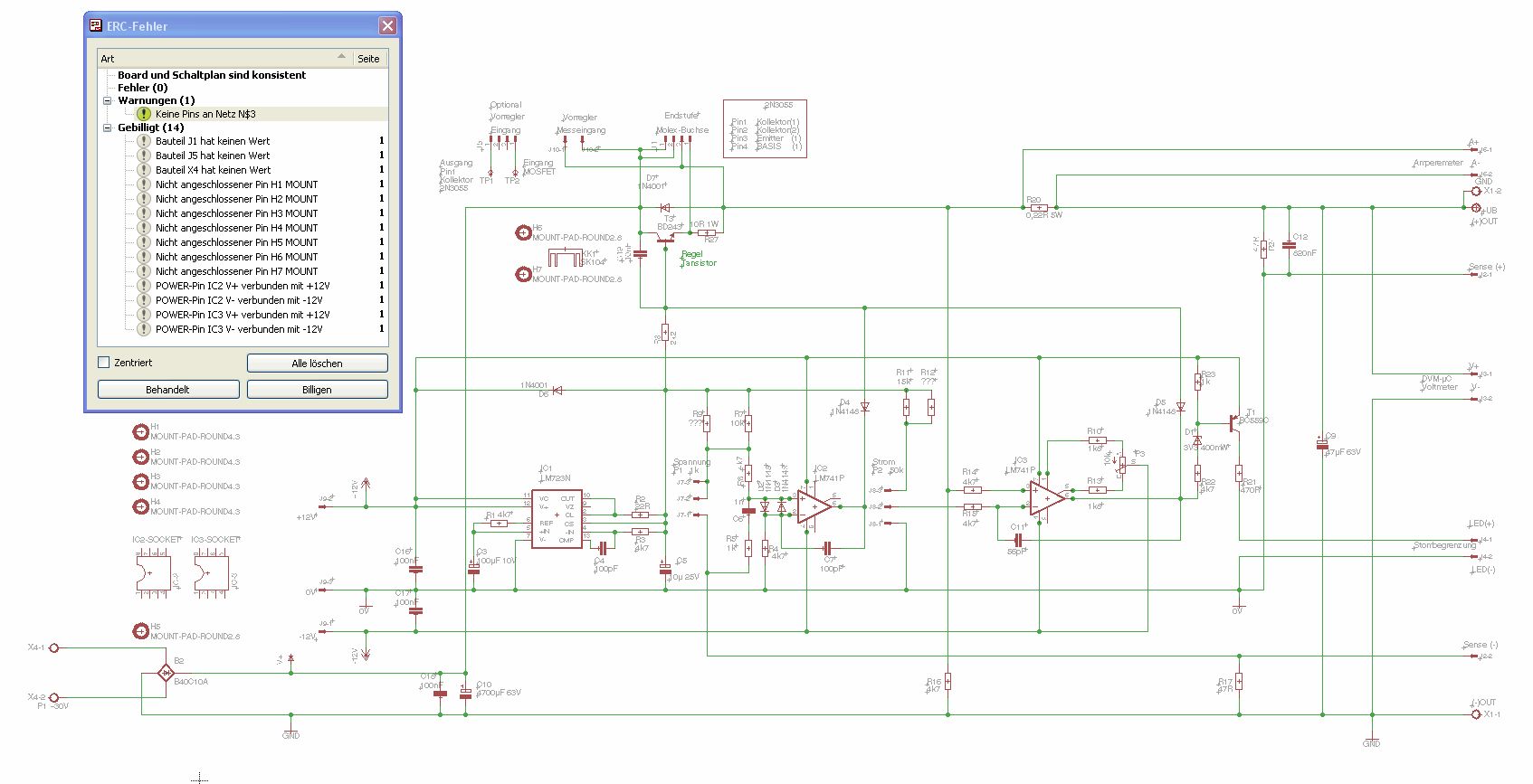 @mike0815 Ich will dir doch nix böses ;-) Wenn jemand ein eagle file hier hochläd ist das erste was ich mache ein erc. Mich hauts manchmal aus den Pantoffeln wenn ich dann die Fehlerliste sehe. Aberdu wißt ja, was ich meine. Ich meckere halt um Fehler zu vermeiden. Es wird halt leicht mal was übersehen, das layout wird gemacht und das Scheißdings läuft nicht. Der Frust ist dann groß. Ich hab grad mal kurz auf die Ver.5.3.4 geschaut: Mich stört etwas der Gleichrichter (GR)B2. Muss es so ein großes Möbel sein? Die Dinger die ich hier habe bestehen aus einem Metallwürfel mit einer isolierten Seite und den Flachsteckern drauf (wie beim Auto). IMHO kannst du nur mit Drahtstücken die Verbindung vom Flachanschluss des GR zur Platine machen, egal ob der jetzt top oder bottom montiert ist. Du hast aber keine "Landeplätze" dafür vorgesehen. Ich nehme an, den Kondi C10 und die Drahtbrücke an Pin 7 des 723 bappst du auf die bottom seite?