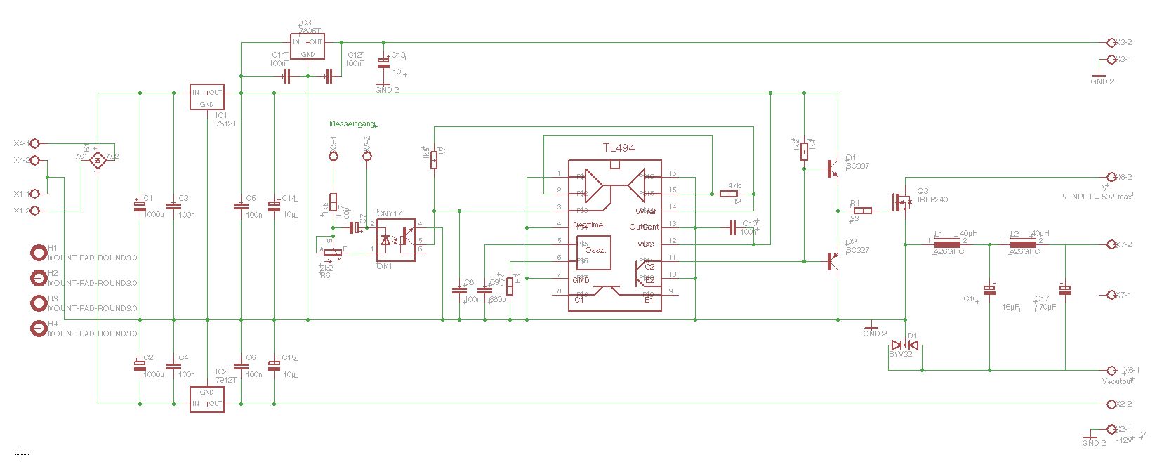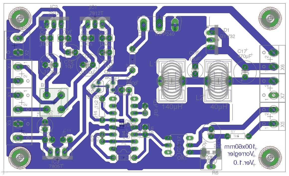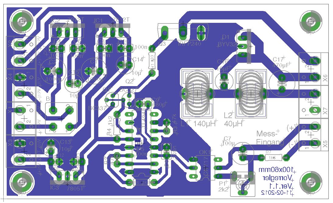 Warte mal ab, ich versuche das nochmal neu zu routen, da mir das mit der Willkür der Lötaugenverteilung noch nicht so gut gefällt. Ich finde es immer schöner, wenn man die Anschlüsse via Printklemmen auf einer Seite der Platine anordnen kann. Vielleicht kommt in nächster Zeit nochmal eine ordentliche und geordnetere Version ;-) Auf jeden Fall freue ich mich, dass es Anerkennung findet! Der Widerstand R10 ist übrigens überflüssig. Mit R9 und R12 wird später die maximale Ausgangsspannung und der max. Ausgangsstrom bestimmt, deswegen sind noch keine Werte angegeben. Außerdem fehlen noch Lötanschlüsse für die Ausgänge (V+; V-; US+; US-). Wie gesagt, neues Routing folgt wahrscheinlich noch. Dann aber auch mit Sicherung, die möchte ich nicht missen (auf Temp. Sensor verzichte ich mal großzügig...)