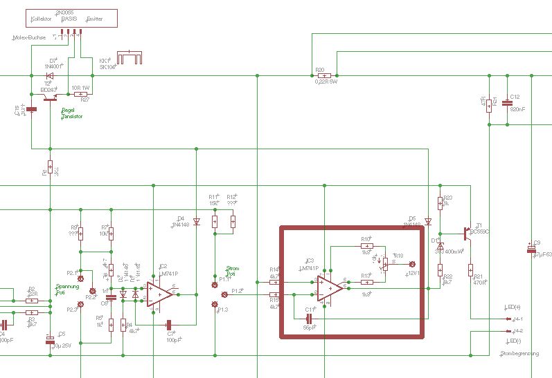 Hallo Ulrich, ich kann dich beruhigen, trotzdem R17 abgeraucht ist(durch meine Schuld), blieb dich Spannung trotzdem konstant und ist nicht angestiegen! Wenn der Sense nicht angeschlossen ist, bleibt auch dann die eingestellte Spannung stabil und steigt nicht an, R17 u. R24 fungieren da als Sicherung. Es kann halt nur nicht mehr ausgeregelt werden. Ich habe R17 mal gegen einen 3W Typen getauscht, der kann den Strom kurzzeitig verkraften, wenn man sich mit dem (-)Sense dumm anstellt. Ich habe jetzt noch ein wenig experimentiert und muß meine vorherige Aussage mit der abfallenden Spannung bei Lastwechsel (100-200mV) revidieren! Beispiel: eingestellte 12V, Verbraucher angeschlossen und das DVM bewegt sich kein bißchen. Erst wenn die Last abgenommen wird, geht die Spannung minimal hoch. Hänge ich die Last wieder an, geht die Spannung auf exakt 12V zurück u. das bei einem Strom von 2,8A. Die Strombegrenzung will noch nicht so richtig funktionieren, alles ein wenig grob. Meine µa741 haben wahrscheinlich einen Hau weg. Dann wäre der Maxstrom noch mit R12 abzugleichen BtW. ist es überraschend, was das Teil alles so aushält. Kurzeitige 10A Kurzschluss, blieben ohne Rauch u. Folgen! Ich habe noch 2x LM709 in der Kiste, die werde ich mal Testen. Alternativ will ich mal schauen, was der TL081 verrichten kann. Gruß Michael