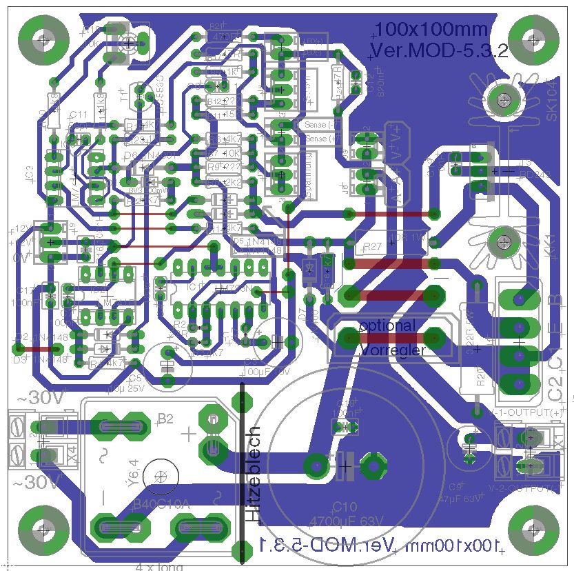Super Wärmeschutzblech. Ich würde den Gleichrichter wohl auch lieber extern montieren. Stellst Du uns das Layout auch so zur Verfügung, dass wir auch ohne Eagle damit eine Platine ätzen können ? Wenn mehrere Leute mitmachen, so könnten uns die ja auch herstellen lassen ! Wer ist mit dabei ?