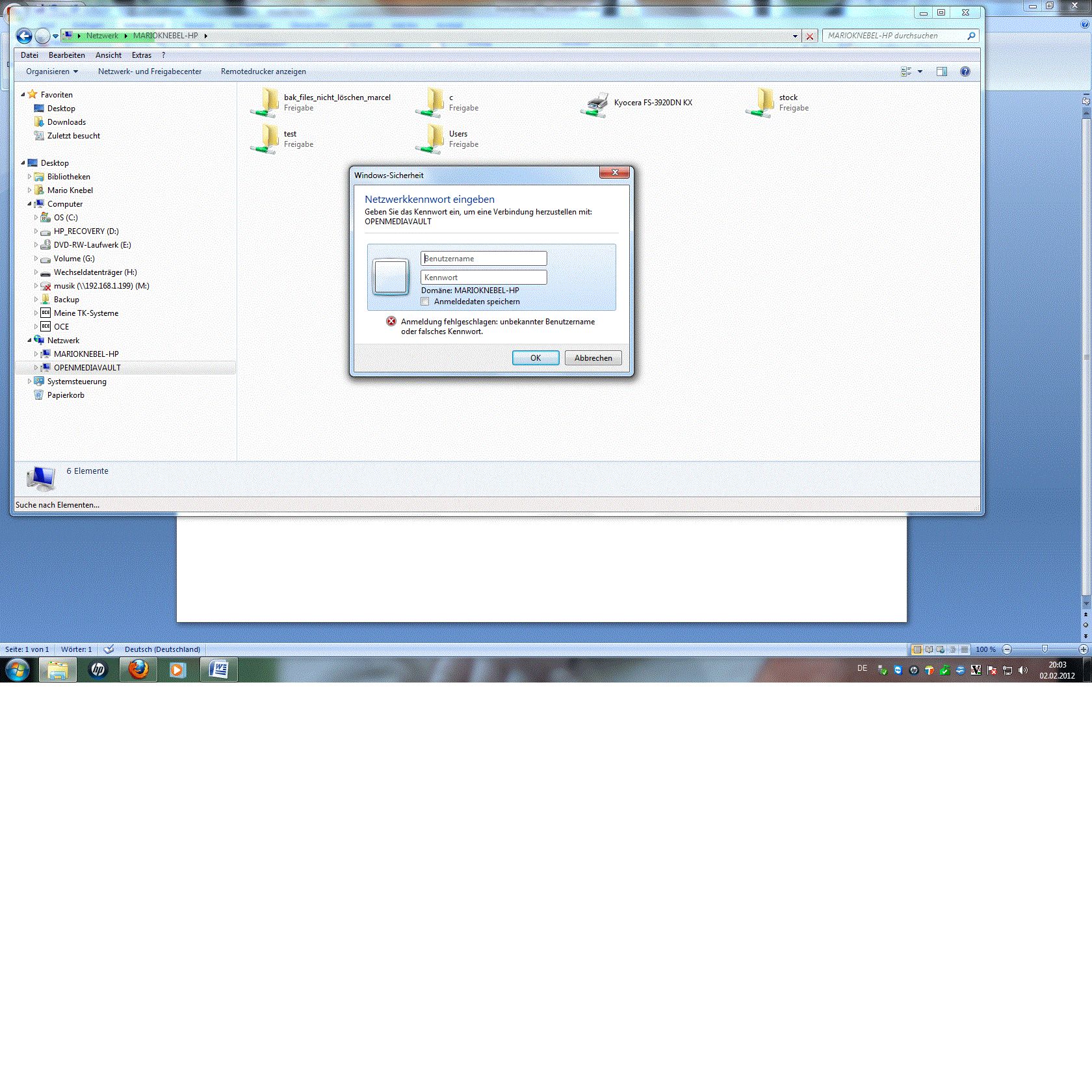 Hallo, ich habe in mein Heimnetzt ein PC mit openmediavault (0.2.6.6 ). Die installation und die anmeldung im Browser alles super. Nun wollte ich unter Win7 auf das Laufwerk zugreifen nur weiß ich nicht wie der Benutzer und das Passwort heißen. Siehe Bild Wer kann helfen?