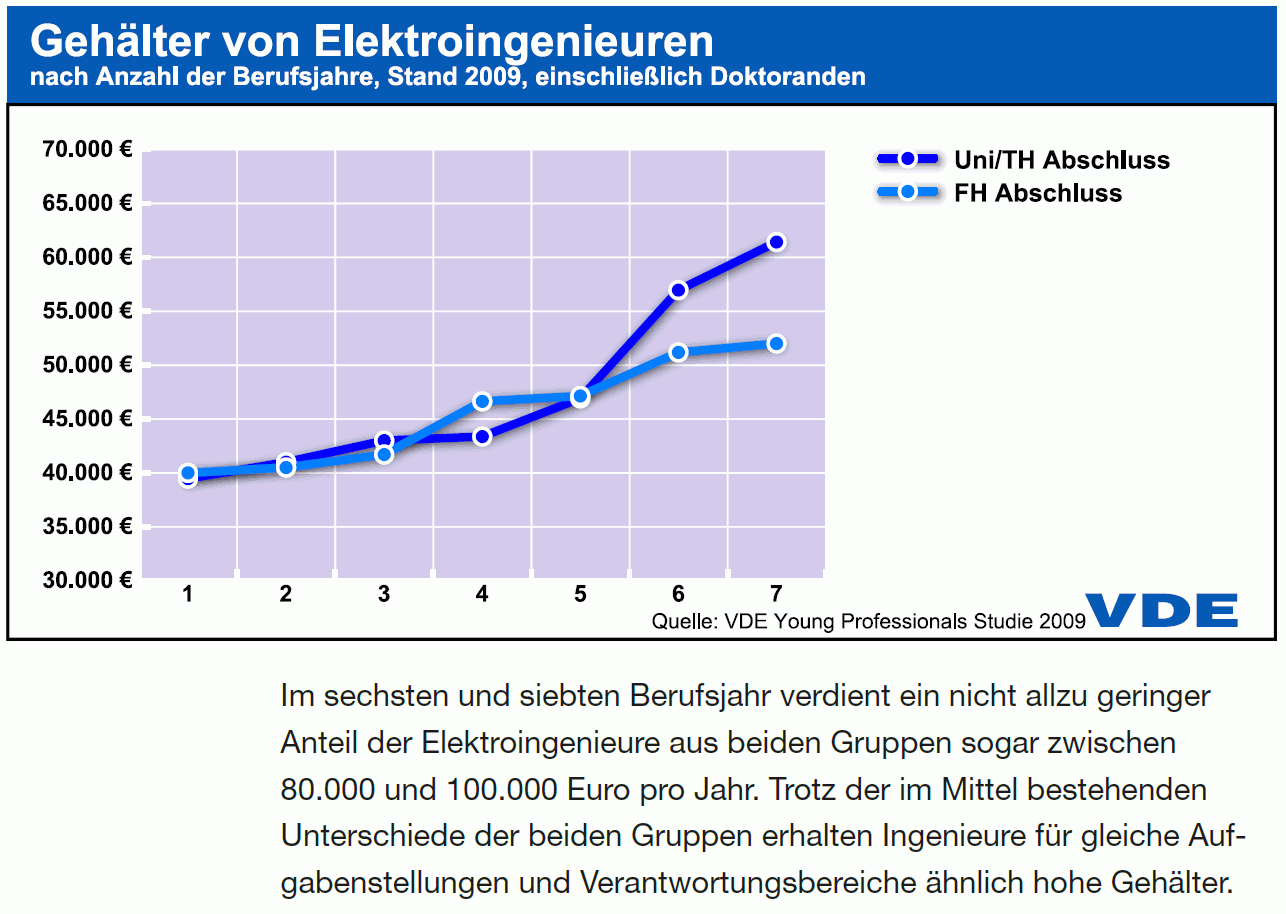 Ich denke, dass die VDE Liste schon realistisch ist. Man sieht ab 5 Jahren BE eine deutliche Gehaltssteigerung. Es ist einfach so, dass man nur durch einen Stellenwechsel eine deutliche Steigerung erhält. Die meisten werden wahrscheinlich nach 4-5 Jahren die Firma wechseln. Und mit 7 Jahren BE ist der Durchschnitt(!) schon bei über 60k.