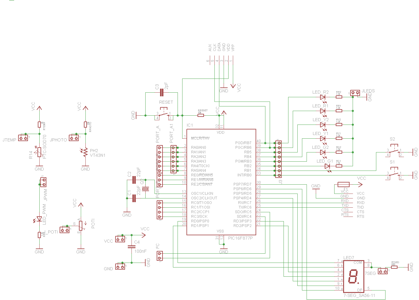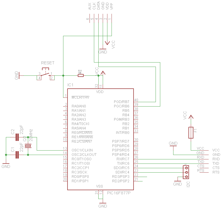 Hallo, ich bin dabei mir ein keines PIC-Board zu bauen. In der Abschlussprüfung der Ausbildung zum Elektroniker für Geräte und Systeme wird häufig der PIC16F887 verwendet. Das Board soll möglichst günstig sein. Eine PicKit2 ICSP-Programmierer ist in der Firma vorhanden. Meine Idee ist es nun mit einem seriellen Bootloader zu arbeiten. Warum? So kann ich in der Firma das Gerät flashen und Zuhause üben. Ich bin mir der erschwerten Problematik bewusst (Hoffe ich zumindest ;-) ). Das würde mir ca. 35€ sparen. Und ich lerne ja auch dabei. ;-). Ich habe jetzt einige Tage gelesen, Schaltpläne im Internet rausgesucht und mich viel mit Eagle beschäftigt (im Wesentlichen damit Bauelemente zu suchen :-) ). Dabei ist folgender Schaltplan entstanden. Ich möchte euch bitten da mal drüber zu sehen. Vielleicht könnt Ihr mir sagen ob und wenn was falsch ist. Ich wünsche allen ein schönes Wochenende Gruß Samuel