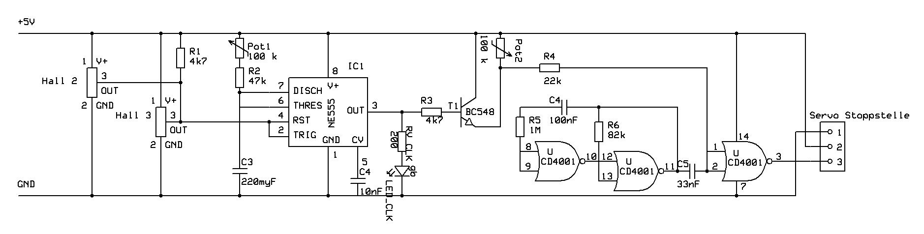 Hallo, bin kein Experte in Elektronik und habe mir nach langem Suchen und Überlegen eine Schaltung zusammengebastelt, die einen Servo über Hallsensoren schalten soll. Über die Hallsensoren soll der Servo für ein bestimmte Zeit in eine andere Position verfahren werden. Nach Ablauf der Zeit soll der Servo wieder in die Ursprungsposition zurückfahren. Für das Zeitglied habe ich einen NE555 verwendet. Schaltung wie im Datenblatt. Für die Servoansteuerung habe ich die Schaltung eines Servotesters verwendet (Bausatz von ...). Die Gesamtschaltung ist von mir :) Liegt an einem der Hallsensoren Signal an, wird Reset und Trigger des NE555 auf GND gezogen. Damit geht Out auf High. Ist C1 über R1 soweit geladen, dass die Spannung an THRES schaltet, wird Out wieder auf Low gesetzt. Kommt vorher erneit ein Signal von den Hallsensoren, wird die Zeit wird neu gestartet, d.h. C1 entladen. Mit Out wird über einen Transistor der Widerstand des Servosteuersignalgenerators zwischen zwei Werten (18k und 18k+Poti) geschaltet. Damit ändert sich das Steuersignal für die beiden Positionen des Servos. Wo ich mir unsicher bin: - geht das mit den Hallsensoren so? - ist die Transistorschaltung richtig aufgebaut?