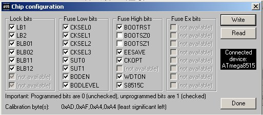 Hallo zusammen, ich versuche gerade einen ATmega8515 zu Programmieren (AVRStudio 4, mit einer neueren läuft mein ISP-Programmer anscheinend nicht) Ich habe eine Frage zu den Fuses. Anscheinend habe ich mir schon einen verfused :( Auf jeden Fall ist er nicht mehr erreichbar. Im Anhang seht ihr eine Grafik, wie die Fuses wohl im TwinAVR ? aussehen sollen. Kann mir jemand sagen, wie das dann im AVR Studio aussehen muss. Ich möchte ungern noch einen Controller verlieren. Wären das : Low High 0xFF 0xD9 ? Wäre klasse, wenn mir da jemand helfen könnte. Vielen Dank! Beste Grüße Steffen