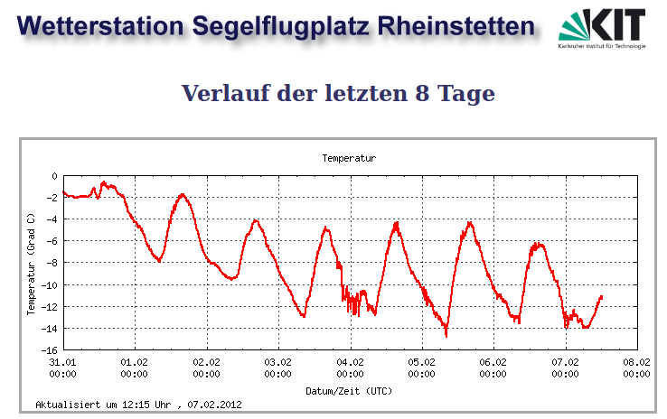 Hier hats letzte Nacht die -14° knapp erreicht - das kommt aber aus der 8-Tage-Graphik nicht so recht raus; auf der für heute wird das etwas deutlicher. Als Anhänge die Fieberkurven zweier Wetterstationen: eine außerhalb der Stadt, eine am Stadtrand.