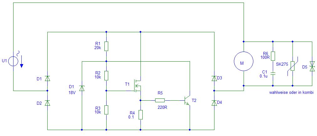 Hallo, hier mal ein Vorschlag. R3 als Poti: Phasenanschnitt (mit wenig EMV), R3 als Optokoppler: deine Lösung, mit Strombegrenzung. T1 IRF830 o. ä., T2 BC550C, D1..4 1N4007, D5 Transzorb...