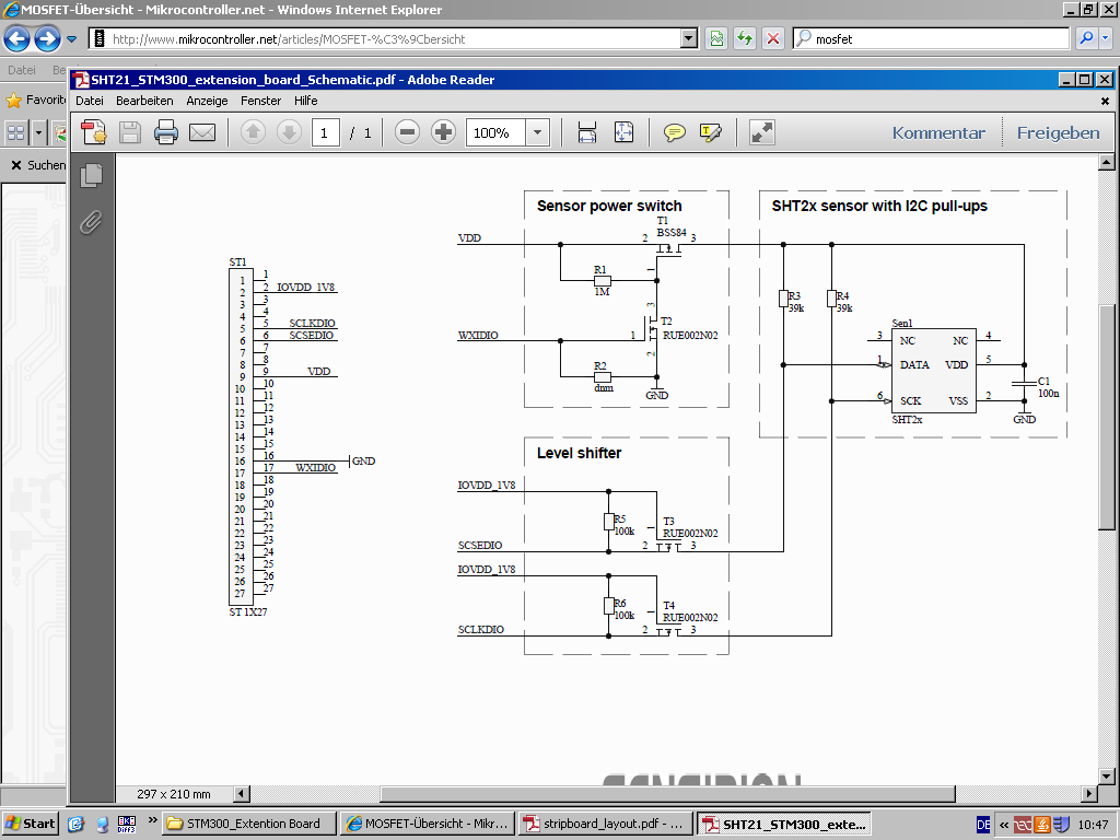 Hallo zusammen, kann mir jemand einen Tipp geben, wieso R2 im angehängten Schaltplan aus einer Application Note mit "dnm" (soll wohl do not mount heißen) bezeichnet ist? Zum Zweck der Schaltung: VDD soll von einem Mikrocontroller an- und ausgeschaltet werden. Der WXIDIO-Pin (digital I/O) ist dafür sehr geeignet, weil er auch im tiefsten Schlafmodus seinen Zustand hält. Der Pin darf mit max. 15μA belastet werden. Er schaltet sehr langsam (<10Hz). Zweck von R2 ist doch, das Gate von T2 sicher auf GND zu ziehen, wenn WXIDIO low, oder? Beim T2 handelt es sich um einen low-threshold-MOSFET, Datenblatt: http://www.rohm.com/products/databook/tr/pdf/rue002n02.pdf Ist die Spannung von WXIDIO stabil genung oder genügt der Gate-Source-Leckstrom, um den niedrigen Pegel sicherzustellen? Warum zeichnet man dann überhaupt einen Widerstand ein? Habe so etwas noch nie gesehen.