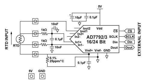 Hallo Ich möchte mittels Pt100, welcher per 4-Leitertechnik an einen AD7793 angeschlossen ist, eine Temperatur im Bereich von ca. -50...+100°C messen können. Leider habe ich auf diesem Gebiet fast keine Ahnung und stecke nun fest... Die Schaltung im Anhang habe ich im Netz gefunden und soweit ich das sehe, sollte sie für meine Anwendung passen. Nun zur Frage; wie ist denn der 0.1% Präzisionswiderstand (unten) zu dimensionieren und auf was muss man achten? Danke