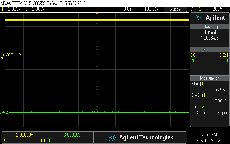 Hallo Leute, ich habe heute mal die µC-Schaltung aus dem AVR-Tutorial aufgebaut um meinen neuen USB-Programmer zu testen. Dabei ist mir etwas sehr kurioses aufgefallen. Wenn ich die Versorungsspannung messe und auf dem Oszilloskop darstelle, ist die ziemlich sauber. Sobald ich nun aber mit dem 2. Kanal die Frequenz des Quarzoszillators messe, zeigt sich auf Kanal 1 eine ziemlich eklige Störung der Versorgungsspannung. Man beachte: in beiden Fällen ist der Quarzoszi mit Spannung versorgt und arbeitet. Kann mir jemand erklären, was das für eine seltsame Rückwirkung ist? Es scheint ja auf jeden Fall durch die Messung der Quarz-Frequenz zu entstehen. Siehe Screenshots. Danke im Voraus und ein schönes Wochenende an alle.