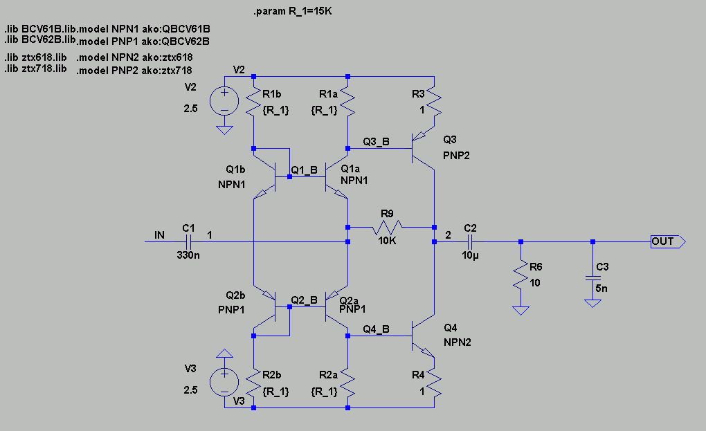 ArnoR schrieb: >> Wie sieht die optimale Verstärkerstruktur für hauptsächlich kapazitive >> Lasten aus? Soweit ich das durchdachte, sollte der Ausgang ein >> Stromausgang sein. > > Bei kapazitiven Lasten ist die Situation besonders schwierig. Die Last > ... > Widerstand oder Induktivität. > Aha. Was hälst du von der angehängten Schaltung und wann wird sie ungewünscht Schwingen? Ich hatte die schonmal gebracht, aber damals keinerlei Rückmeldung erhalten. Entstanden ist sie aus der Not: - es keinen passenden billigen OpAmp gab - die Betriebsspannung sehr klein sein muß (jedenfalls wenn man normale Audio-Schaltungen betrachtet) - am Ausgang eine hauptsächlich kapazitive Last mit einem großen Wertebereich hängen wird (irgendwo 100pF bis 100nF) - und natürlich realisierbar (billig, verfügbar) - und nicht gleich bei einem Kurzschluß abbrennt. Sie macht mir aber gedankliche Sorgen wegen der Stabilität wenn mit realen Bauelemente-Toleranzen realisiert. Nein, ich habe sie noch nicht aufgebaut. >> Für eine Gegenkopplung müßte man ja dann einen Strom >> rückführen. > > Nein, man kann einen Strom mit einem Widerstand in eine Spannung > wandeln. Der Lautsprecher ist aber eine komplexe Last! Keine Ahnung, ob das wichtig ist. Vielleicht kann man das mit einem Stromsensor-Widerstand in der Rückleitung hindengeln.
