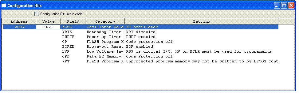 Hallo, habe den pic16f876 mit einem Programm(blinken eines pins siehe Anhang) programmiert, soweit alles klar. Nun habe ich die Schaltung aufgebaut aber das Pin schaltet nicht. Beim Messen mit dem Oszi habe ich bemerkt dass der Oszillator nicht schwingt... Im Anhang Programm + Bild der configuration bits einstellung! Aufbau! Pin1 MCLR mit 10kOhm auf Ub+ Pin8 VSS Masse Pin19 VSS Masse Pin20 VDD Ub+ Pin9 OSC1 Quarzoszillator 3,8Mhz Pin10 OSC2 Quarzoszillator 3,8Mhz Pin21 RB0 Widerstand 220OHm + Led auf Masse