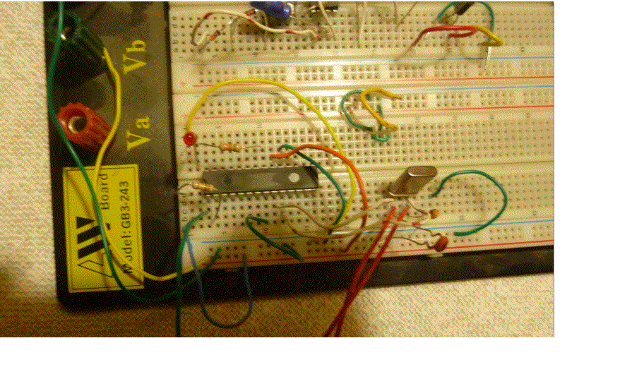 Ja mein erstes Projekt mit uC! So, funktioniert jetzt, hab den quarz direkt am uC angeschlossen+die 2Pinreihen des uC näher ran damit diese sicher kontakt am Steckboard haben+led war falsch gepolt(Fabriksfehler, der Draht mit der Kerbe ist bei dieser Led plus)