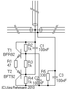 Ups, stand weiter unten: Zur Versorgung des Gyrators muss dem Signal eine Gleichspannung überlagert werden, wie es z.B. auch in der SAT-Technik üblich ist. Da die verwendeten HF-Transistoren kaum mehr als 10 Volt vertragen, muss bei höheren Betriebsspannungen das RC-Glied R5/C3 und ggf. weitere Maßnahmen zum Überspannungsschutz eingefügt werden. Je nach Dimensionierung und Betriebsspannung können Signalpegel bis zu mehreren Vss weitgehend verzerrungsfrei verarbeitet werden.