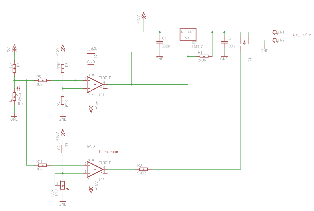 guest ak schrieb: > zu Elko4: > > wie stellst du dir das mit dem mosfet vor? Der Spannunsteiler am Komparator müsste dann halt mit R10 auf die Spannung eingestellt werden, bei der die Lüfter anhalten sollen!