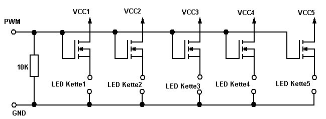 Ich habe einen LED Regler, der mir LED Ketten mit eingebautem Vorwiderstand ansteuert. Dieser Regler liefert PWM mit 12V und kann bis zu 2A belastet werden. Ich möchte jetzt anstatt einer, 5 LED Ketten ansteuern. Ich dachte mir, dass ich einfach 5 Mosfet nehme und diese mit dem LED Regler ansteuere. Da die einzelnen LED Ketten räumlich ca. 5 Meter entfernt verbaut werden möchte ich jede LED Kette mit einem eigenen Netzteil versorgen. Ich möchte den Mosfet STP7NK30Z verwenden. IDS 5A UDS 300V UGS 30V RDS on 0,9Ohm Kann ich auf den Serienwiderstand verzichten, da die PWM-Quelle 2A liefern kann, oder sollte ich noch einen 10 bis 100 Ohm Serienwiderstand in die Gateleitung einbauen? Ist dieser PWM Verteiler, wie ich skizziert habe so in Ordnung, oder sollte ich etwas verbessern?